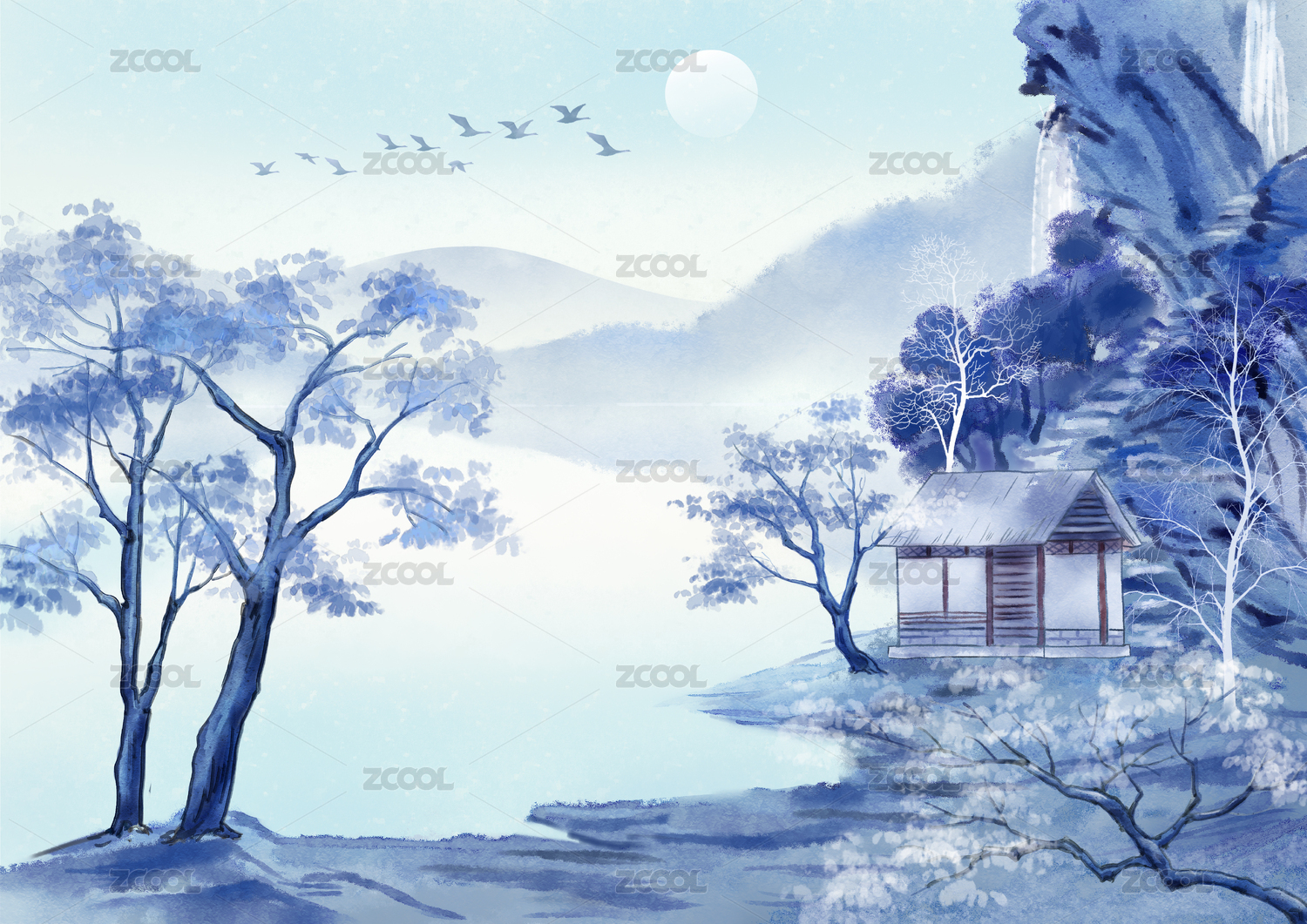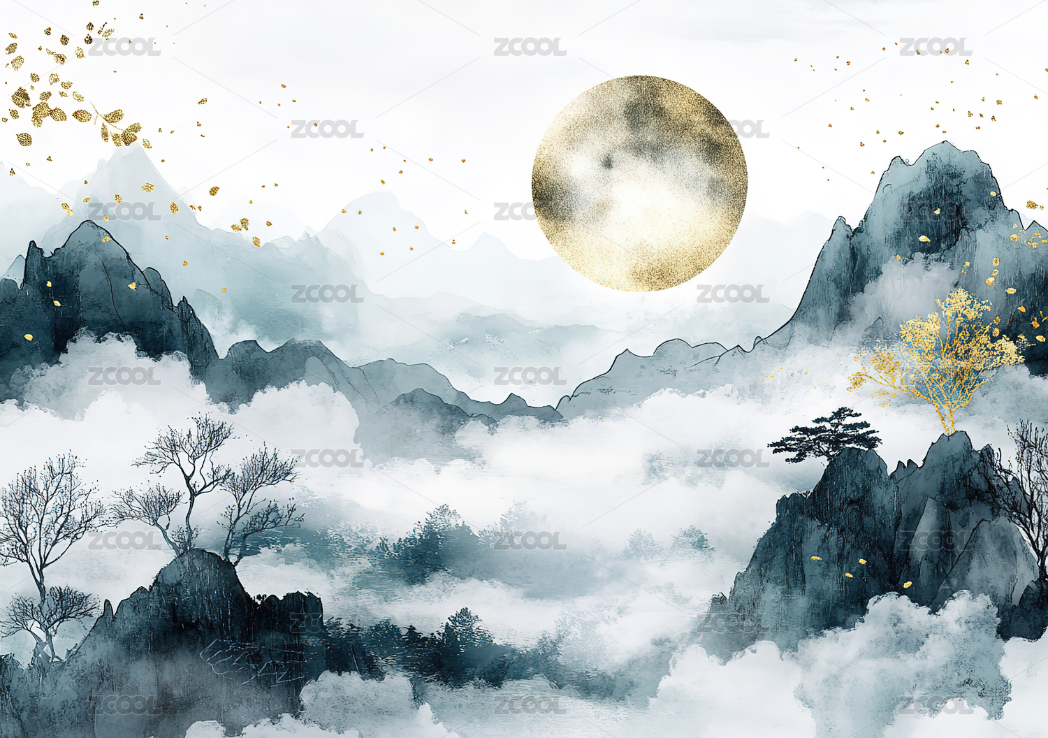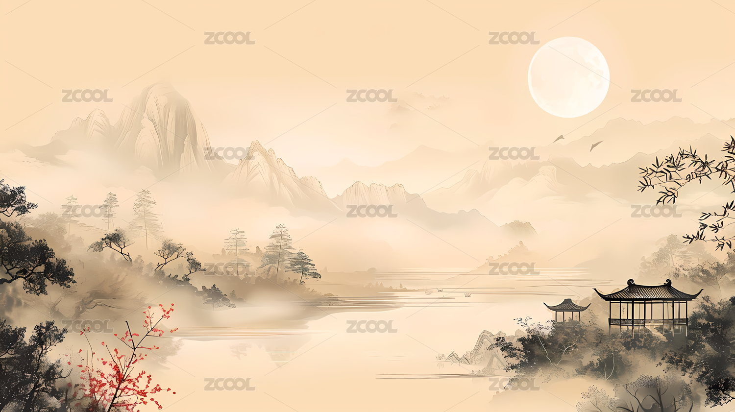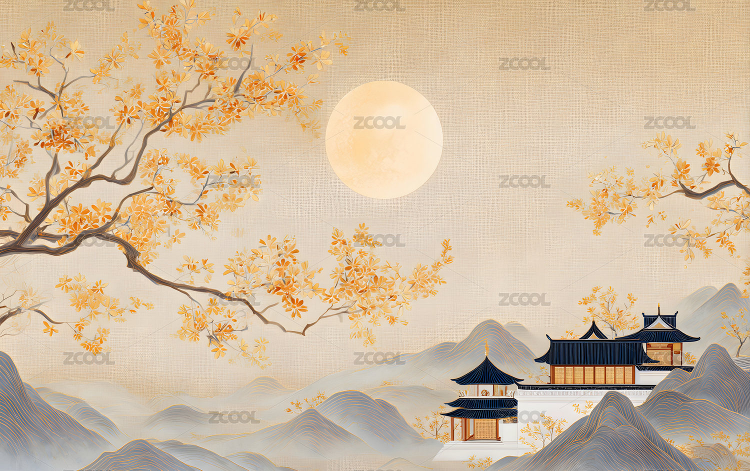 中国风,山水,满月,山峦,树木,金色云彩,大树,白花,古色古香,亭子