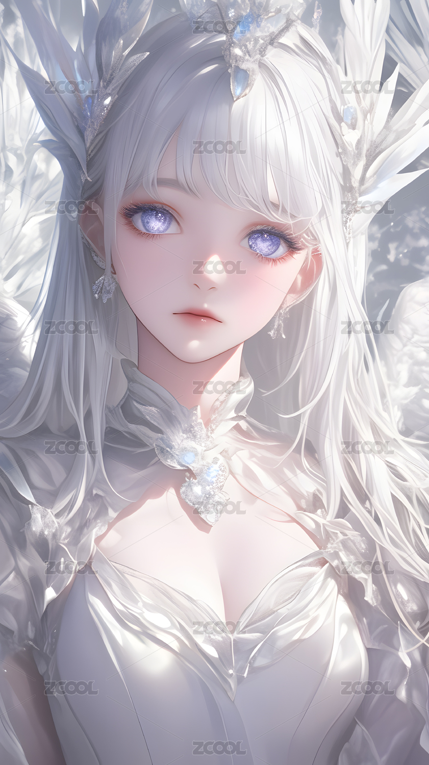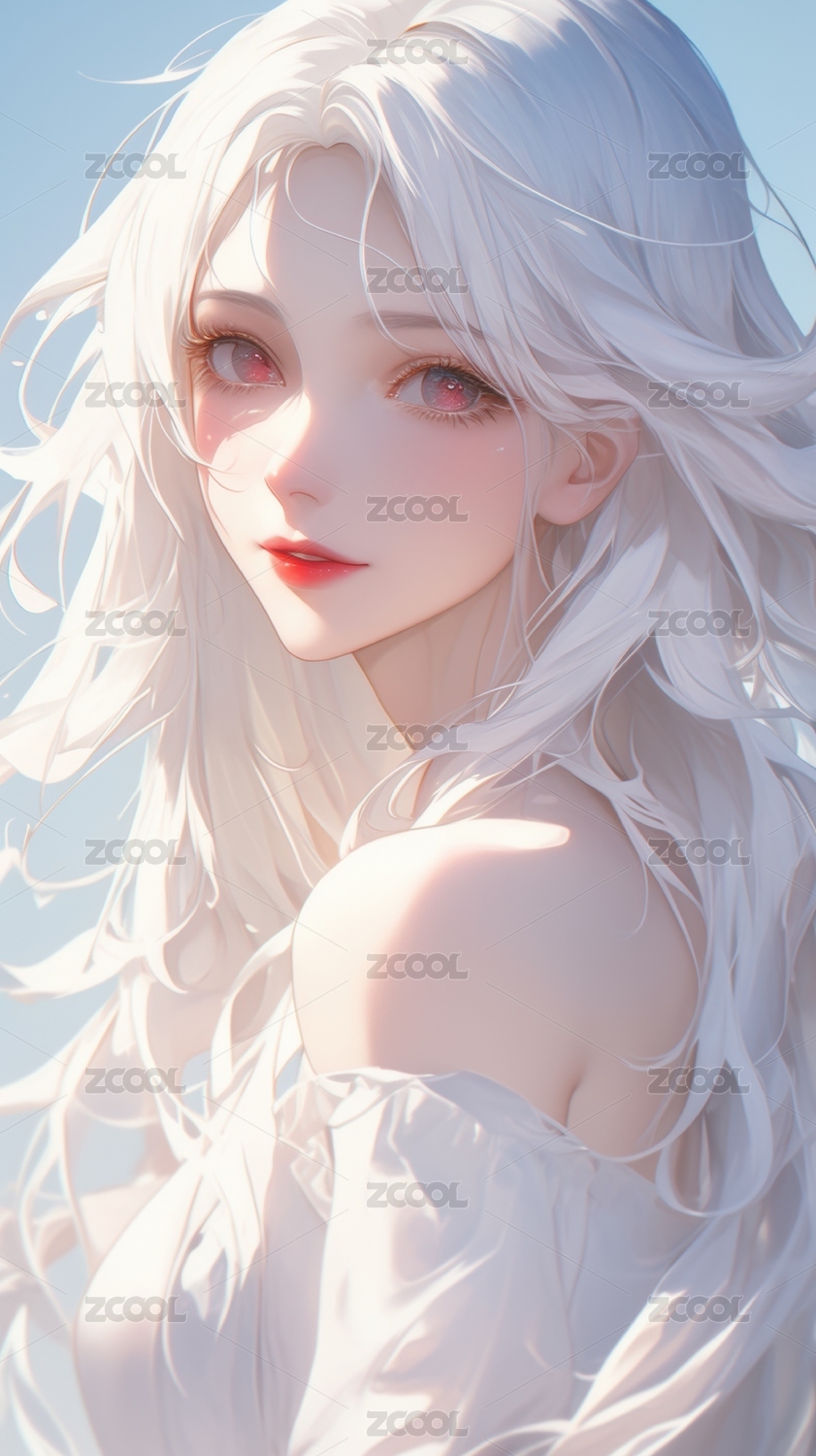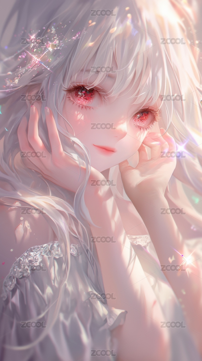 梦幻少女轻抚脸颊银发红眼闪耀光芒