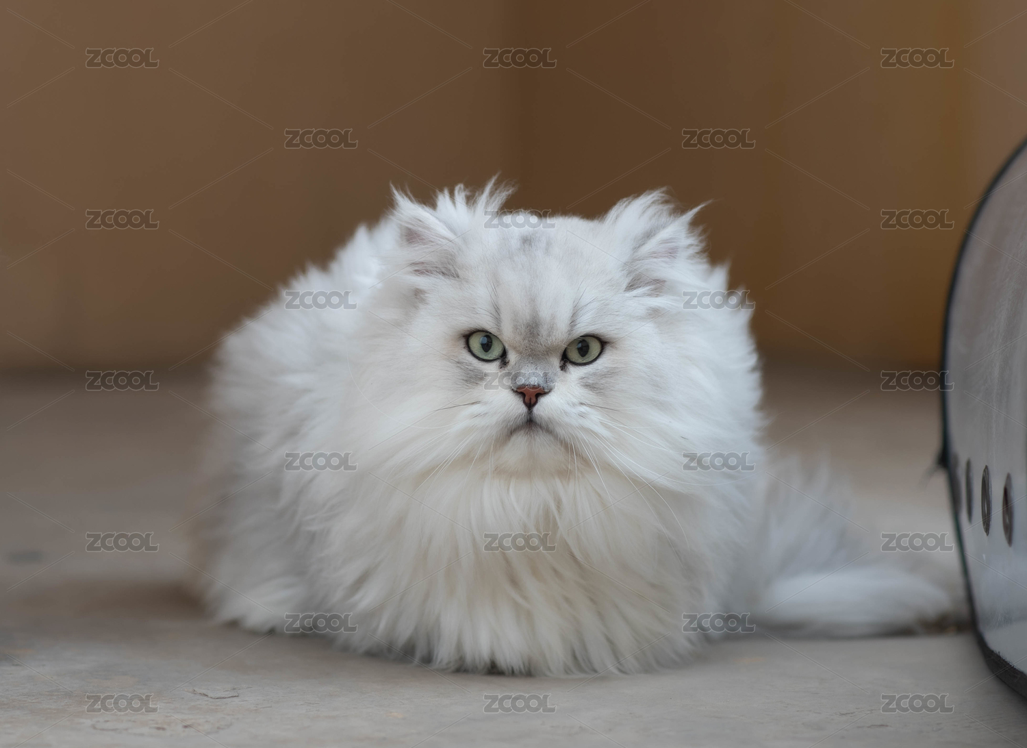 一只趴在猫包旁边胖胖的金吉拉长毛猫