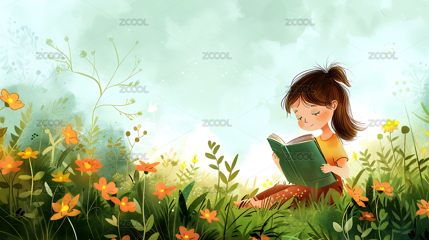坐在草地上阅读的女孩