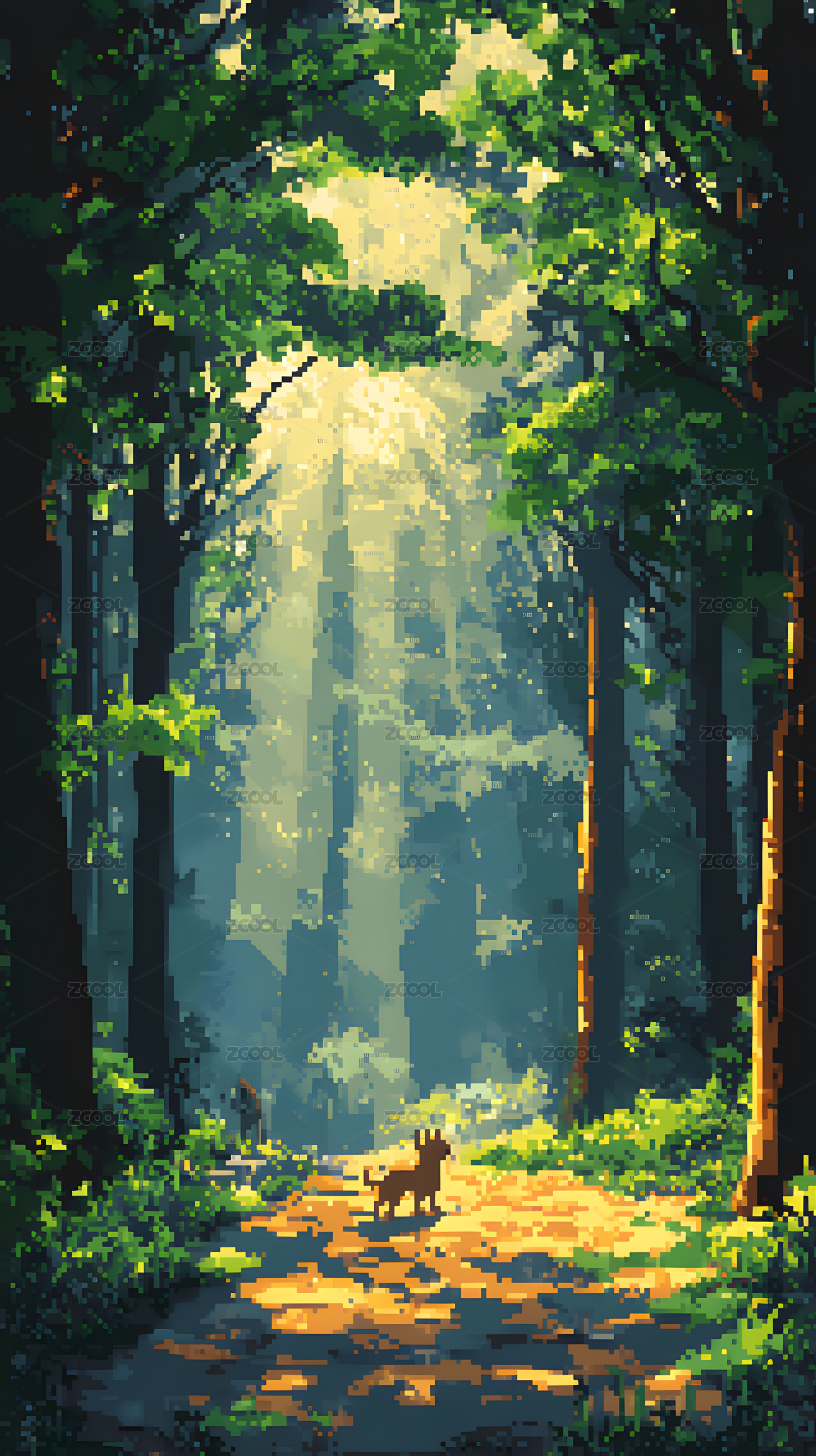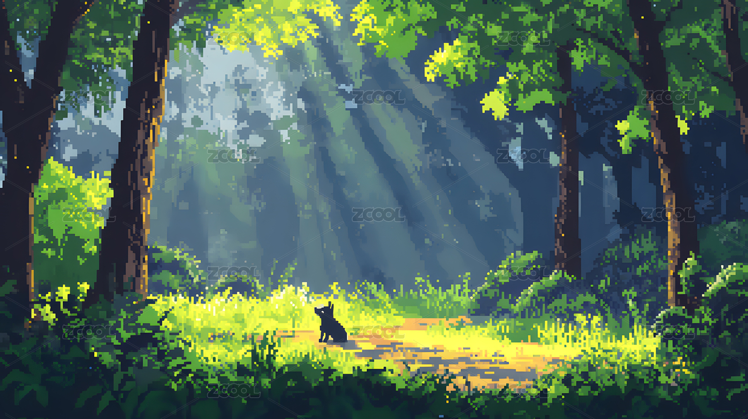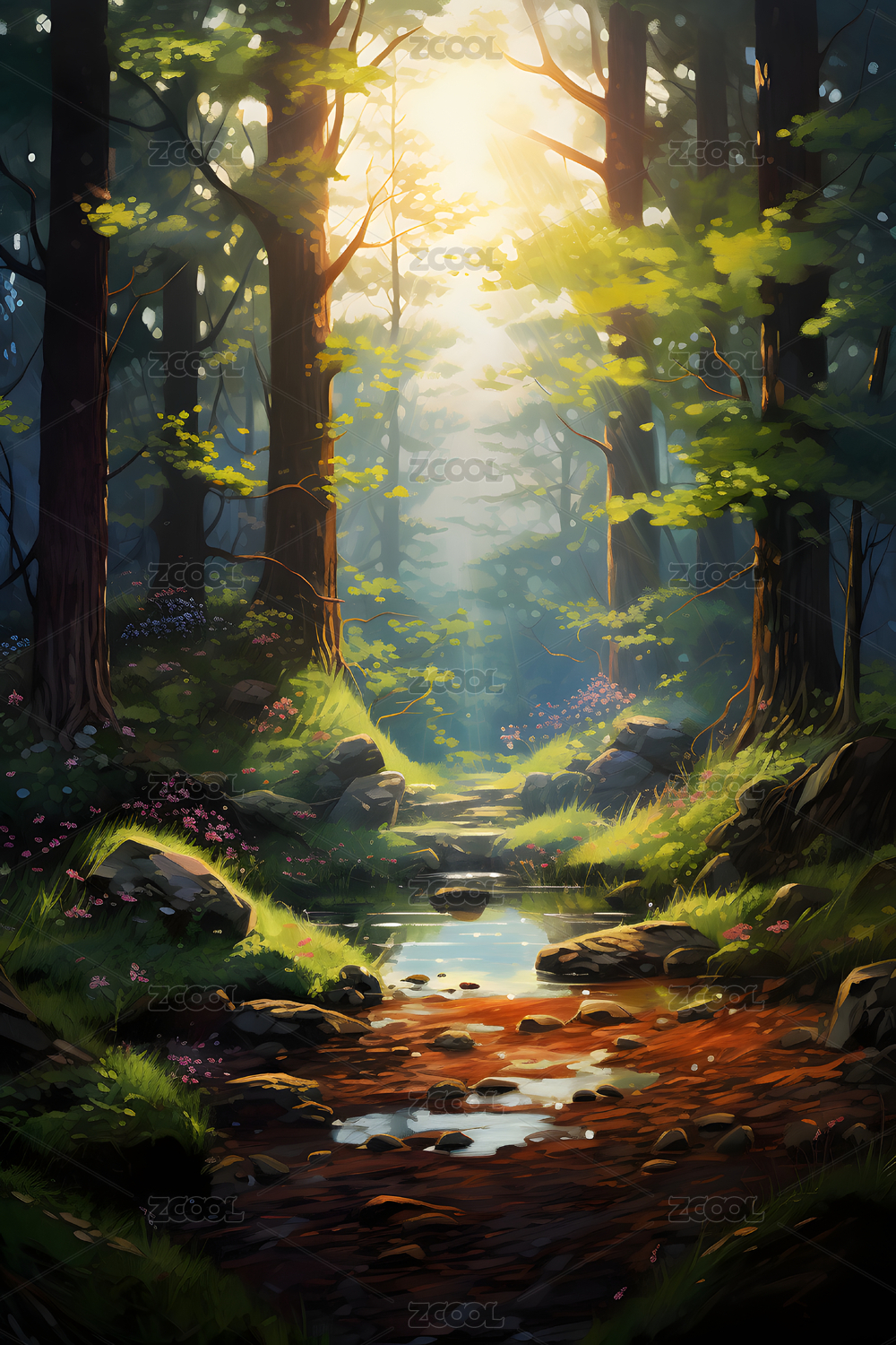 幽静绿色茂密森林中的清澈小溪插画绘画