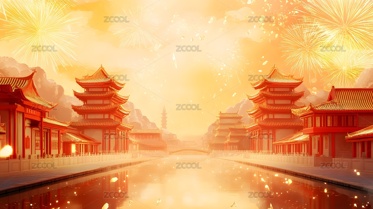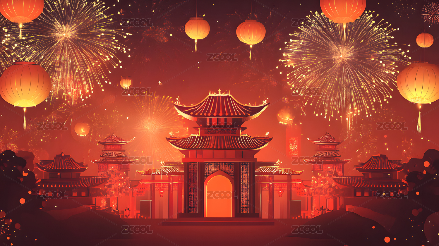 建筑,宫殿,城堡,烟花,夜晚,红色,中国风,山脉,月亮,灯光