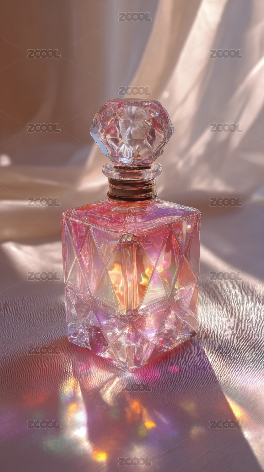 粉色香水瓶在光影中的特写
