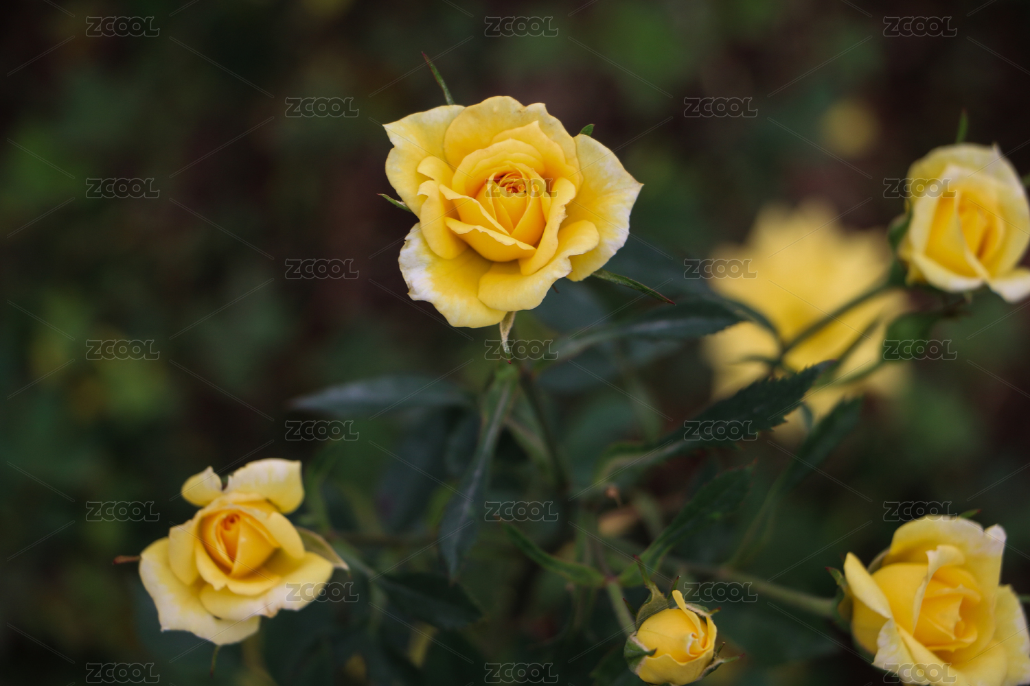 清晨温暖的阳光照耀在花园里黄色月季花上