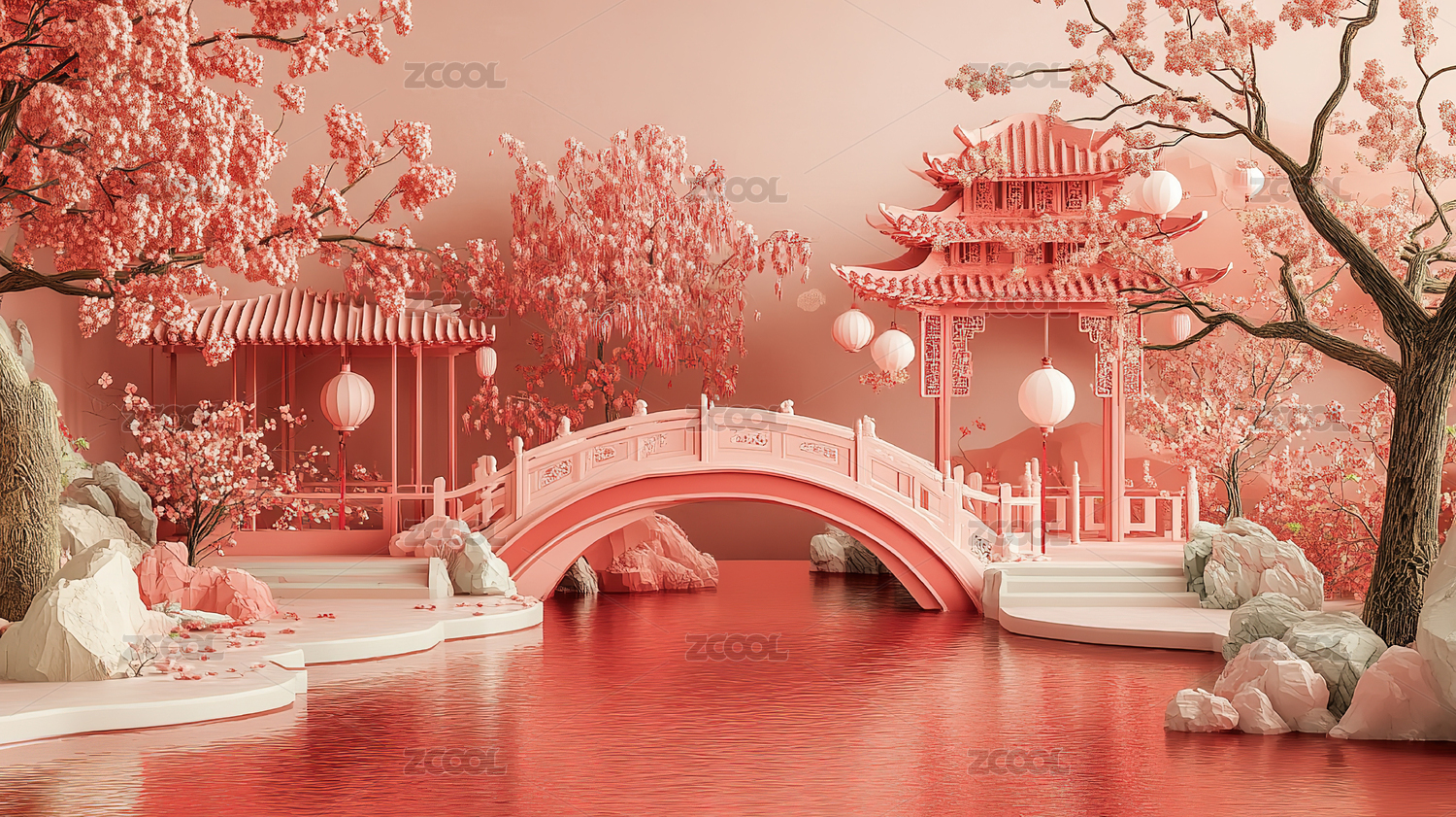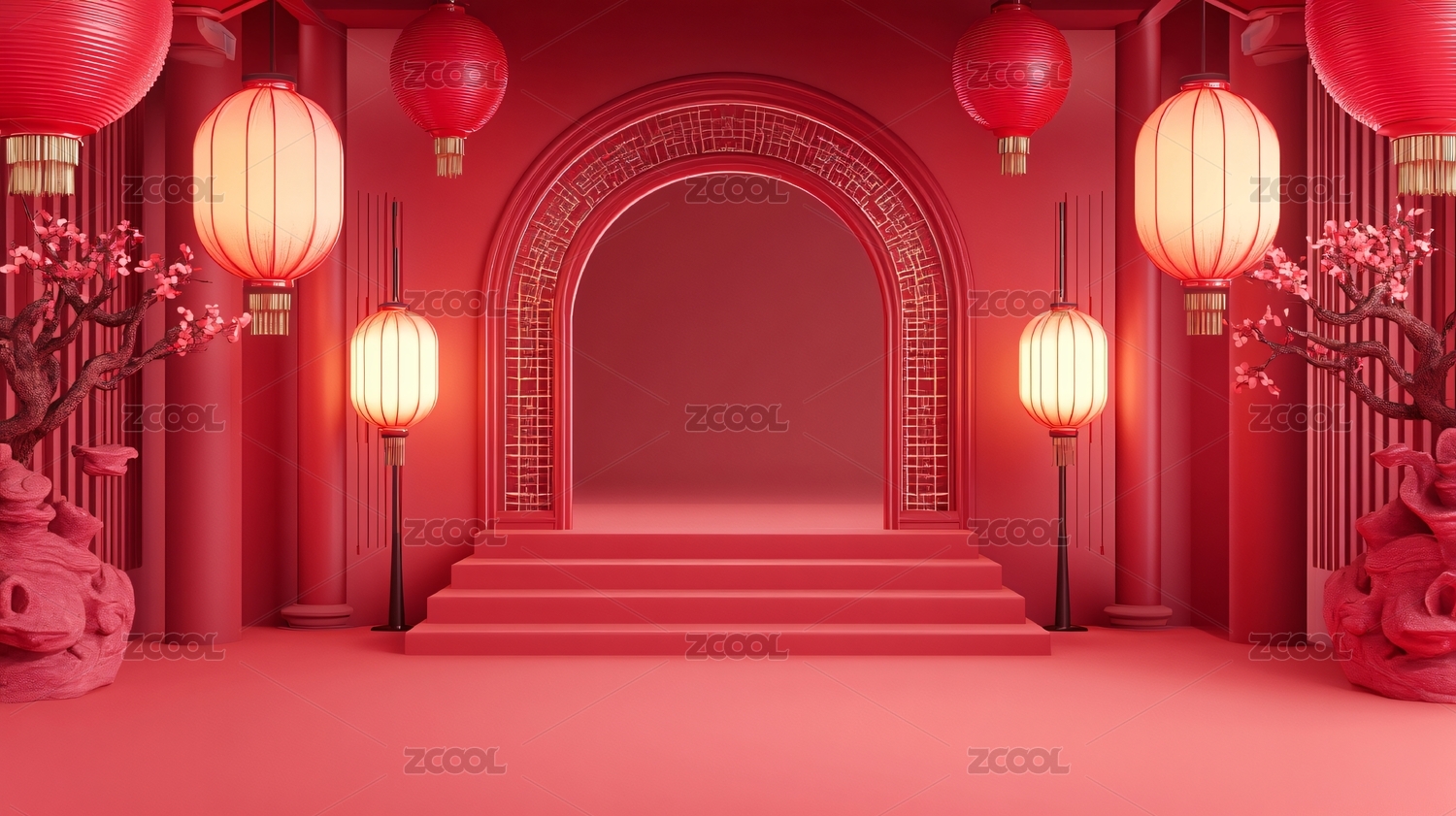 中国风红色喜庆新年灯笼花卉产品展台背景