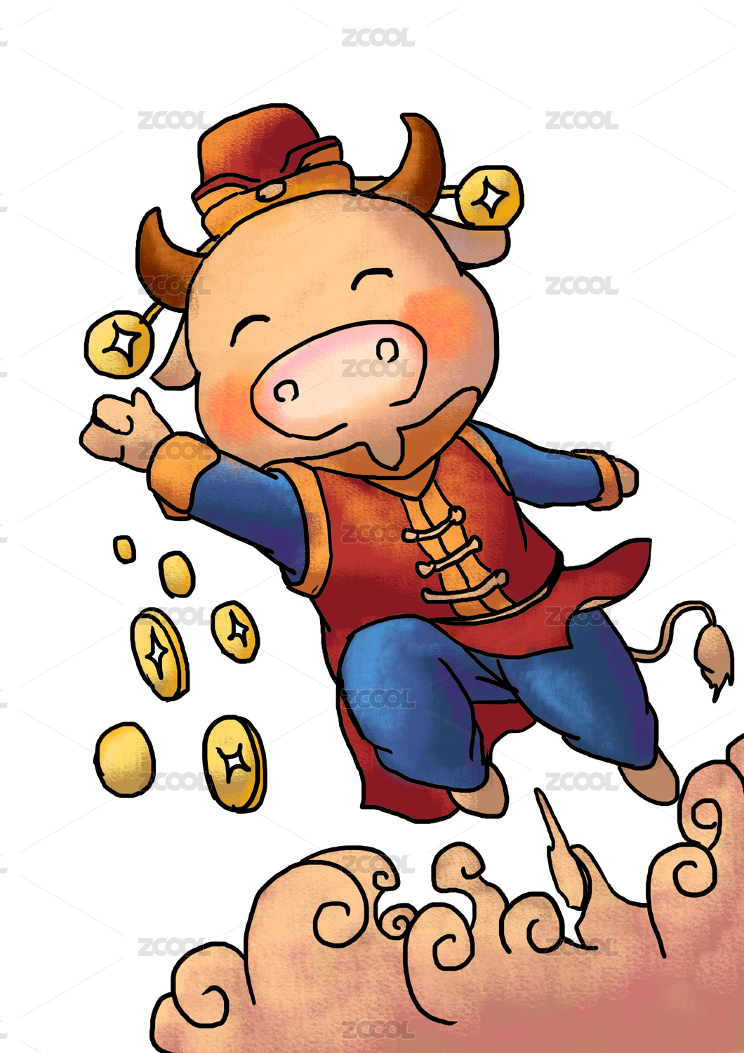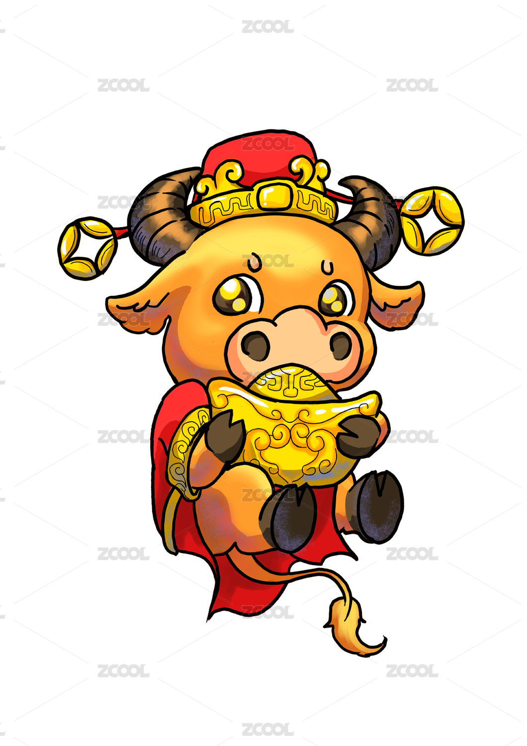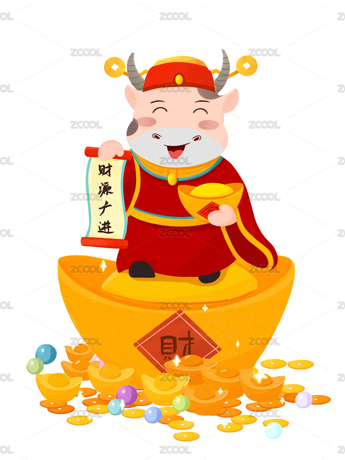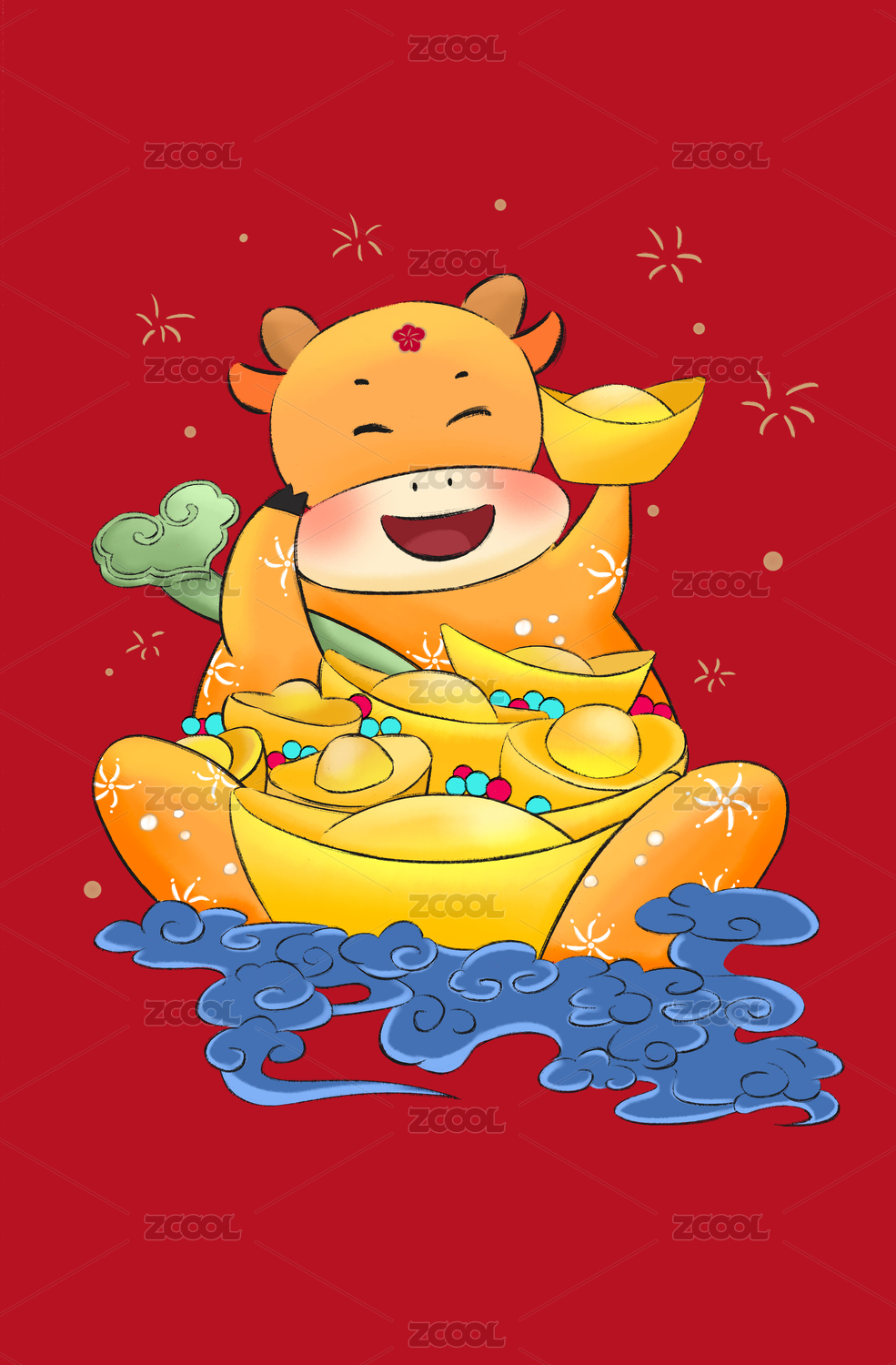 2021,牛年,新年,牛,元宝,金元宝,铜钱,国潮,手绘,吉祥