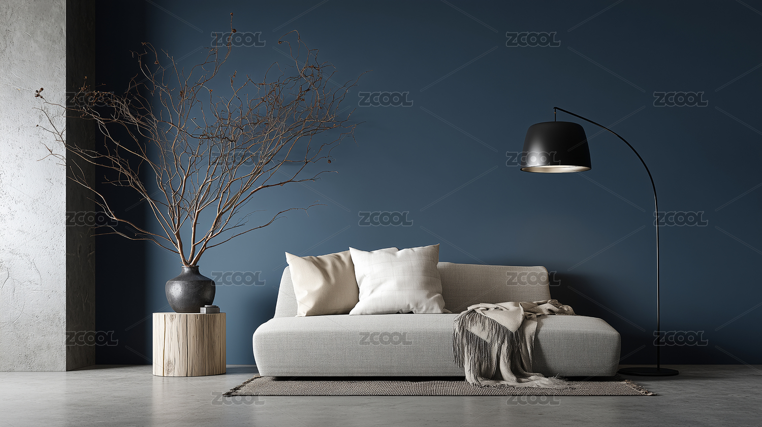 客厅,沙发,蓝色,地毯,靠垫,落地灯,圆形,光影,墙面,装饰