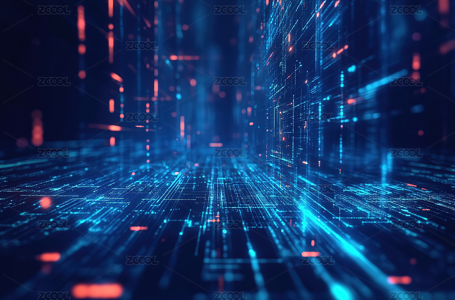 蓝色与橙色光束交织的数字隧道