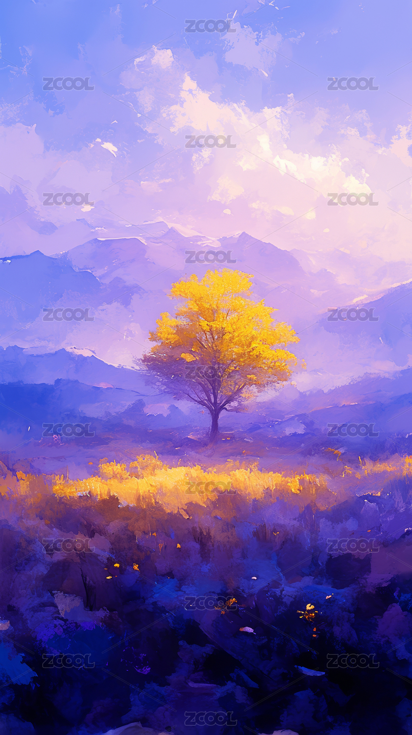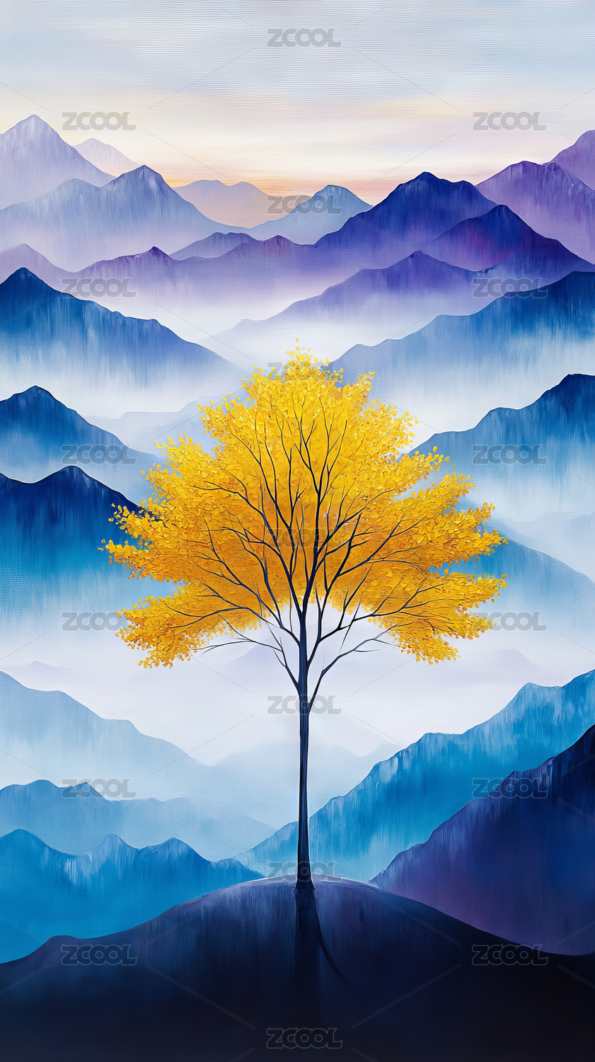 金色树与蓝雾山峦