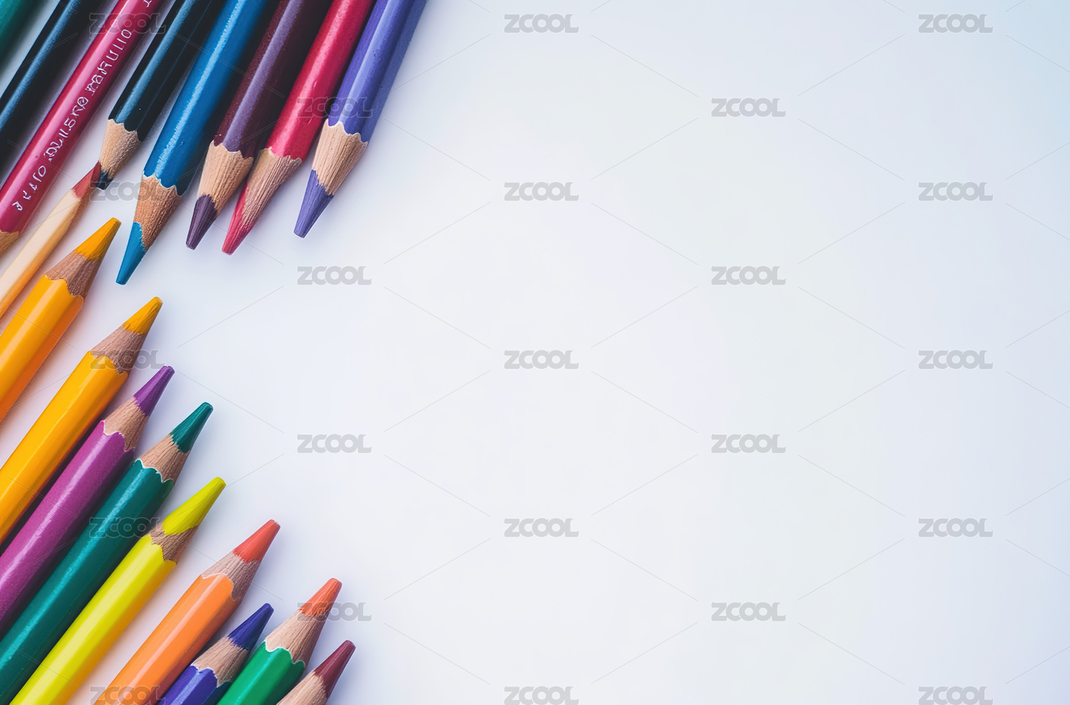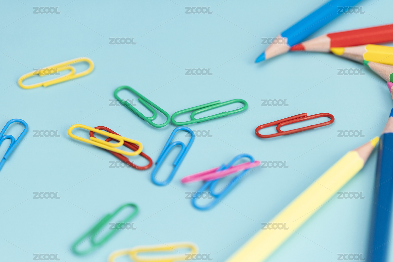 白底上随意散落的几根彩色铅笔回形针与票夹