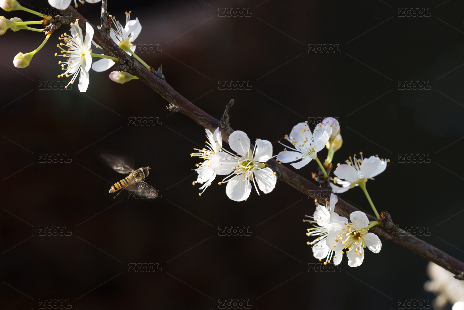 黑背景下一只食蚜蝇悬停在一枝白色的李花前
