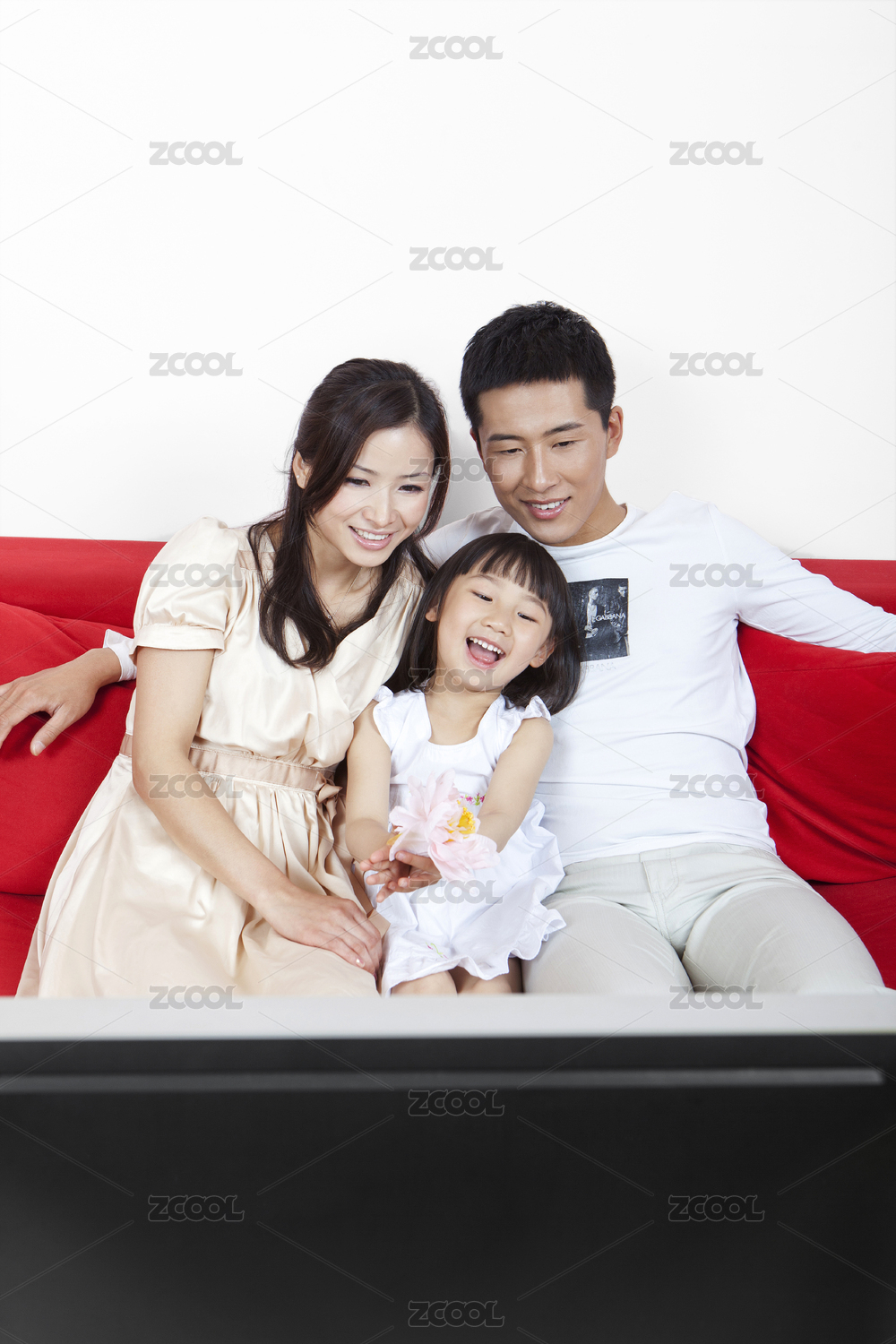 父亲,母亲和女儿看电视,微笑