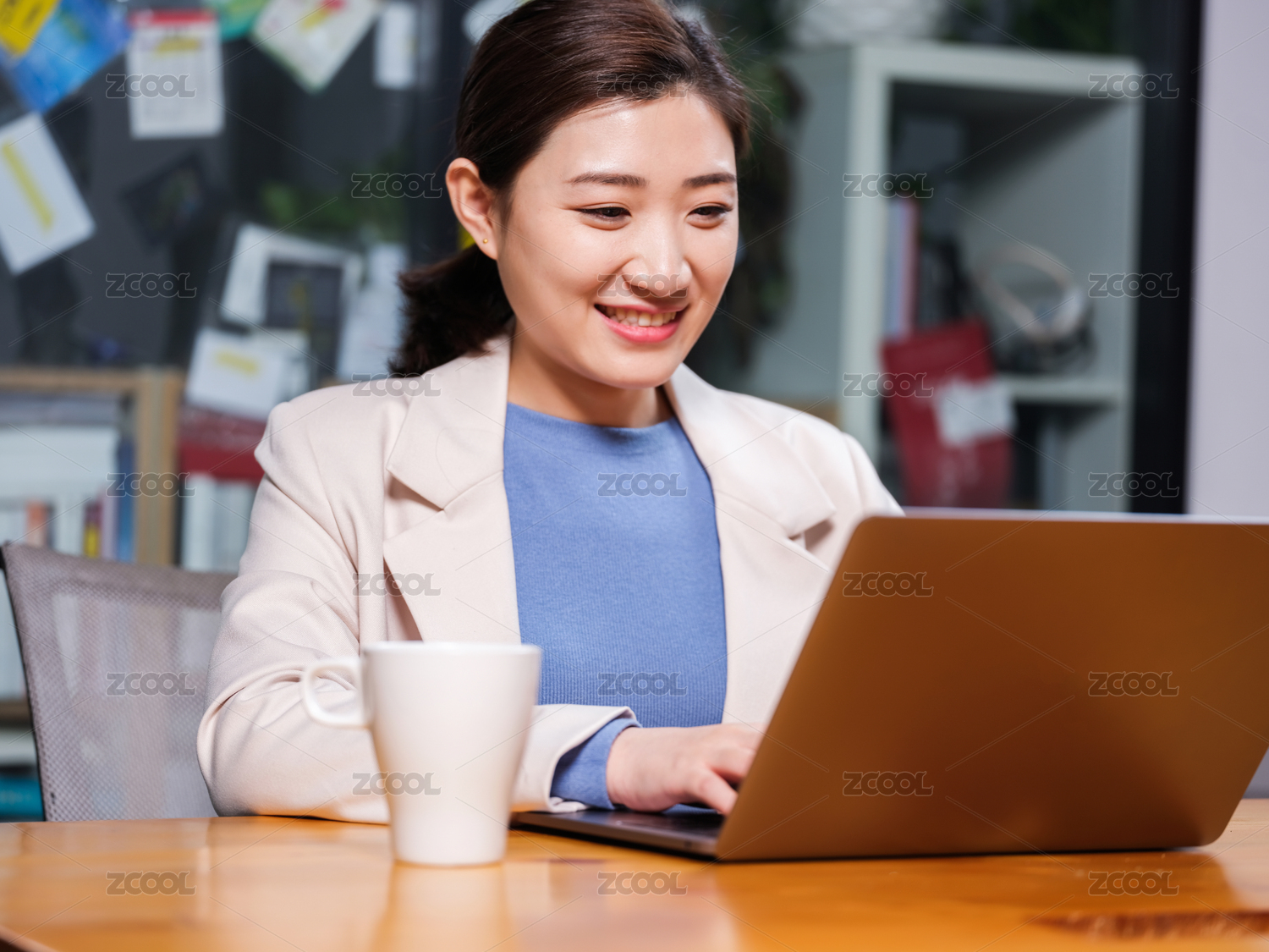 美丽的年轻亚洲女性手端咖啡杯坐在电脑前
