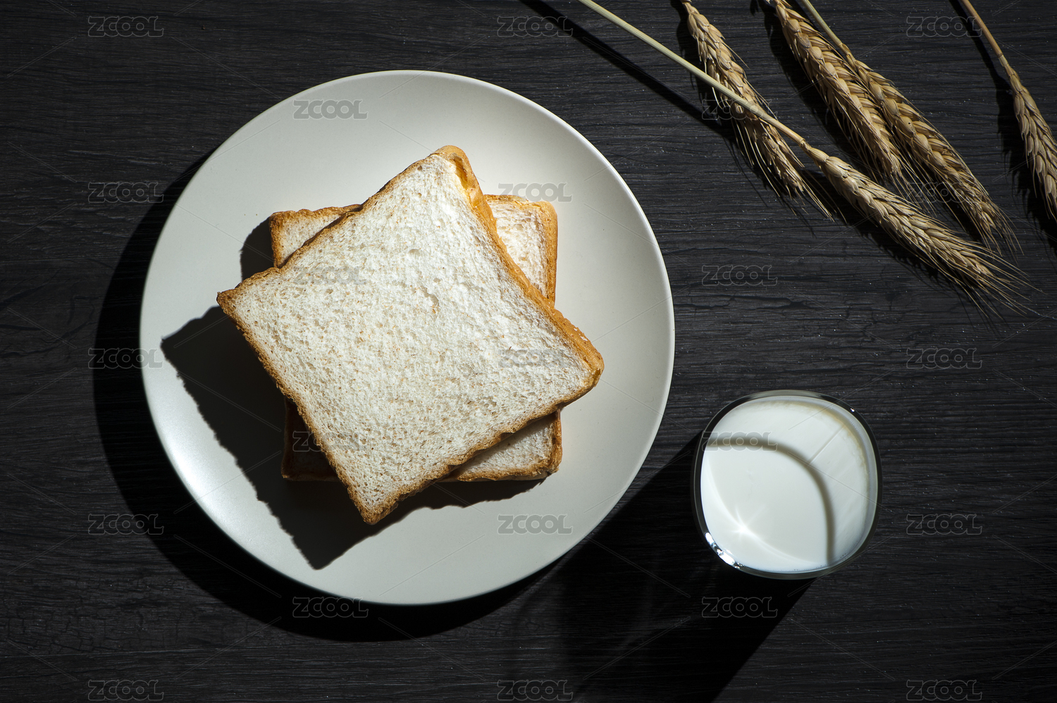 面包片牛奶鸡蛋特写黑色背景