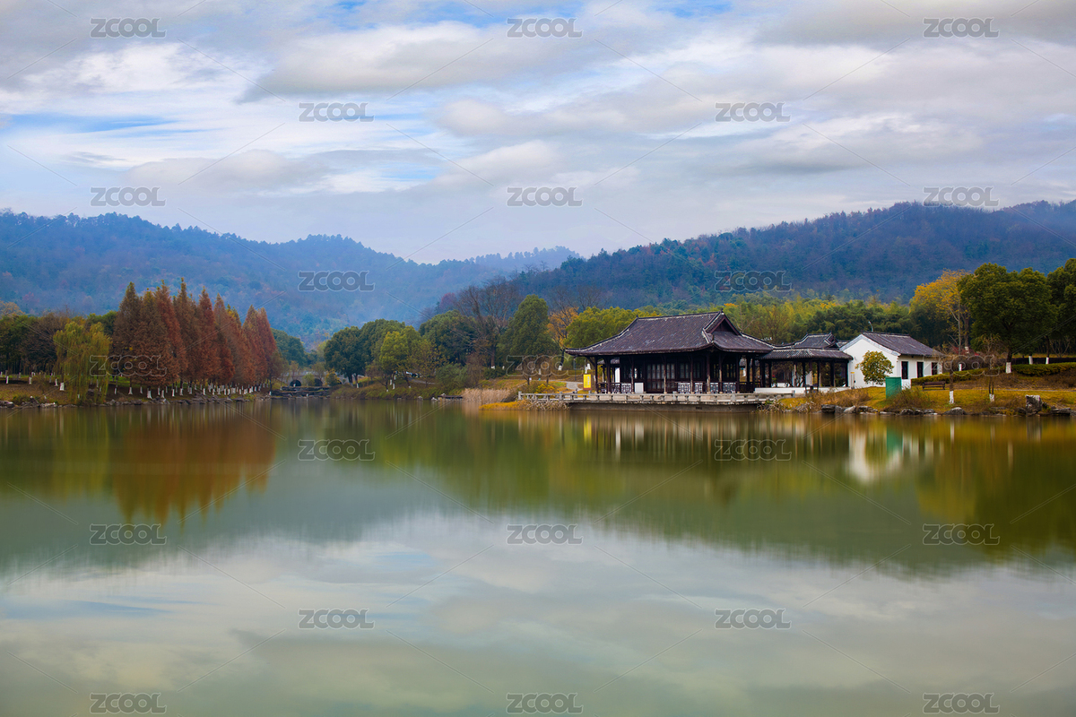 中国浙江杭州西湖风光花港观鱼秋日黄昏