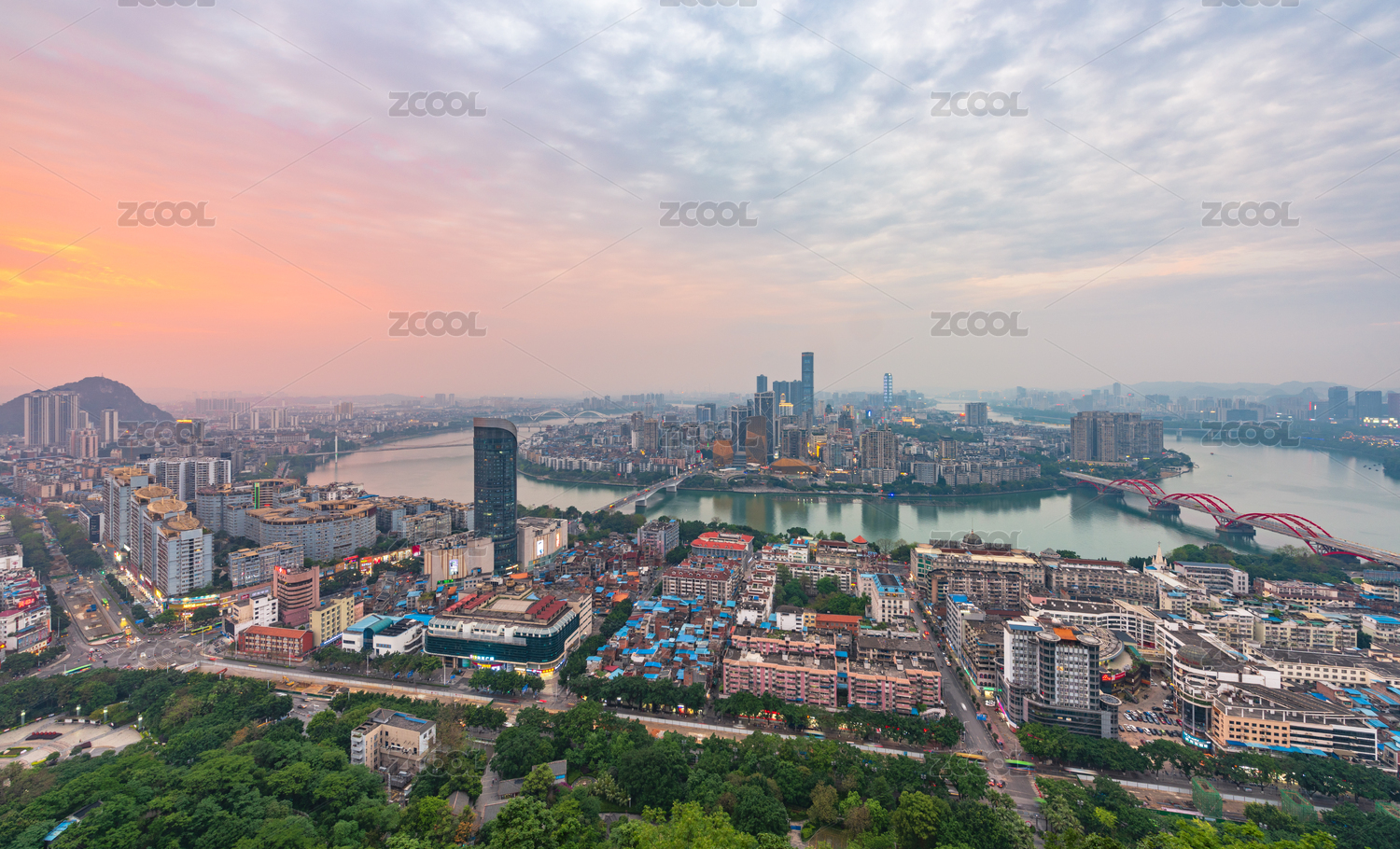 广西柳州市马鞍山傍晚时分的城市天际线风光