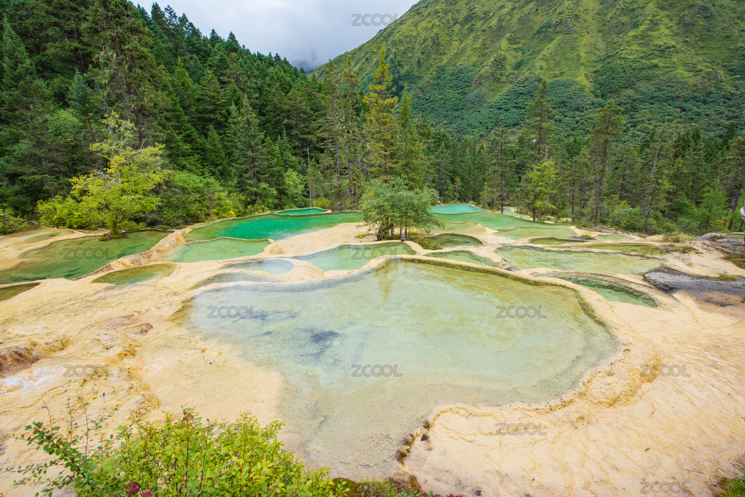 四川,黄龙,雨天,靛蓝,树木,瑶池,五彩池,彩池,水,地质