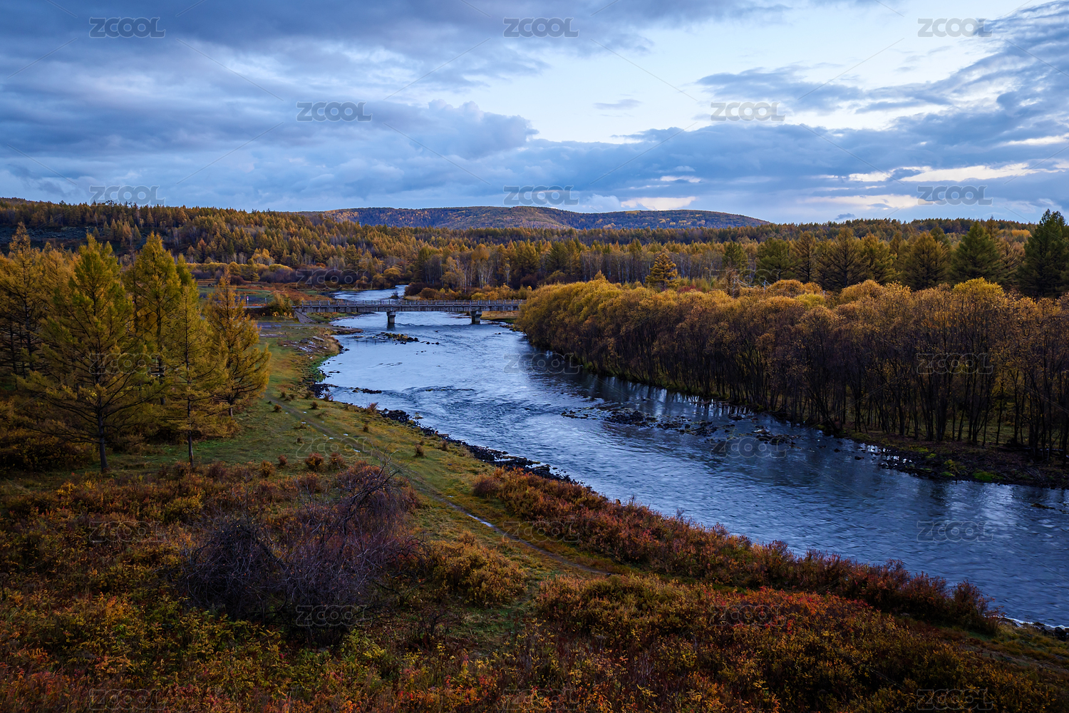 秋天山下宁静的河流