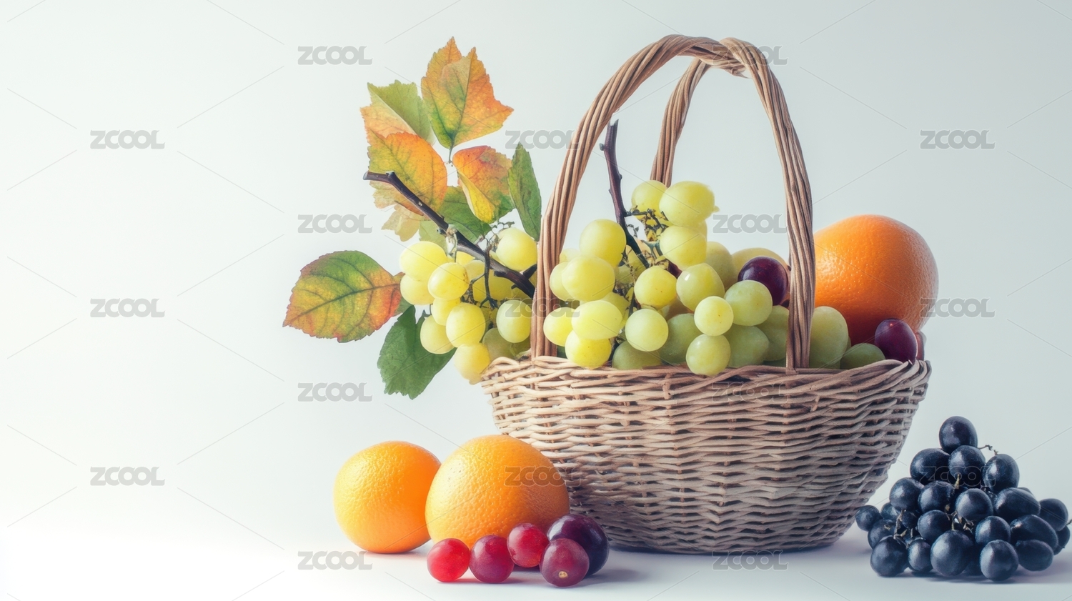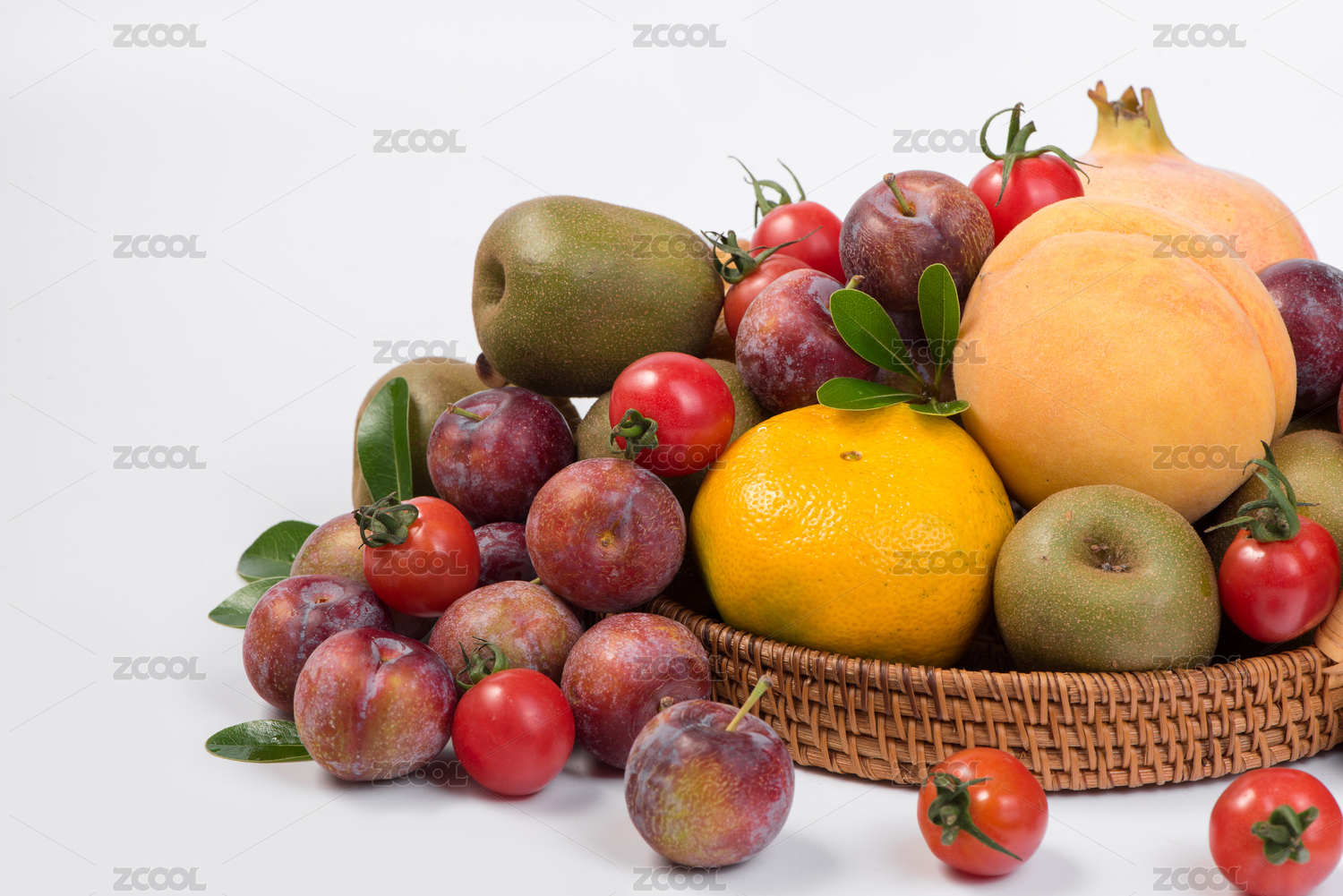 白色背景中苹果葡萄梨新鲜水果堆积在一起