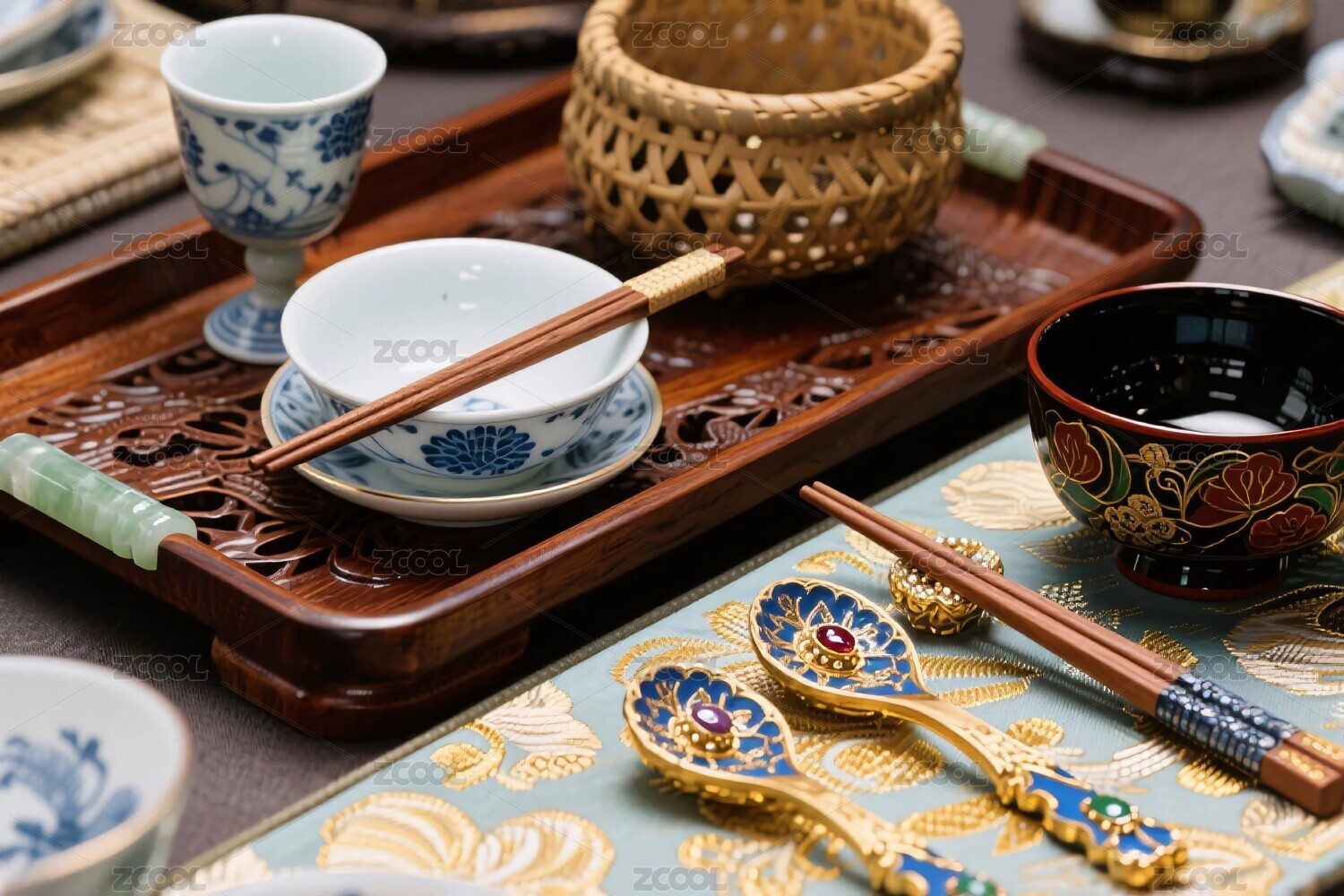 仿古中式木质茶盘托盘摆放在桌面上特写