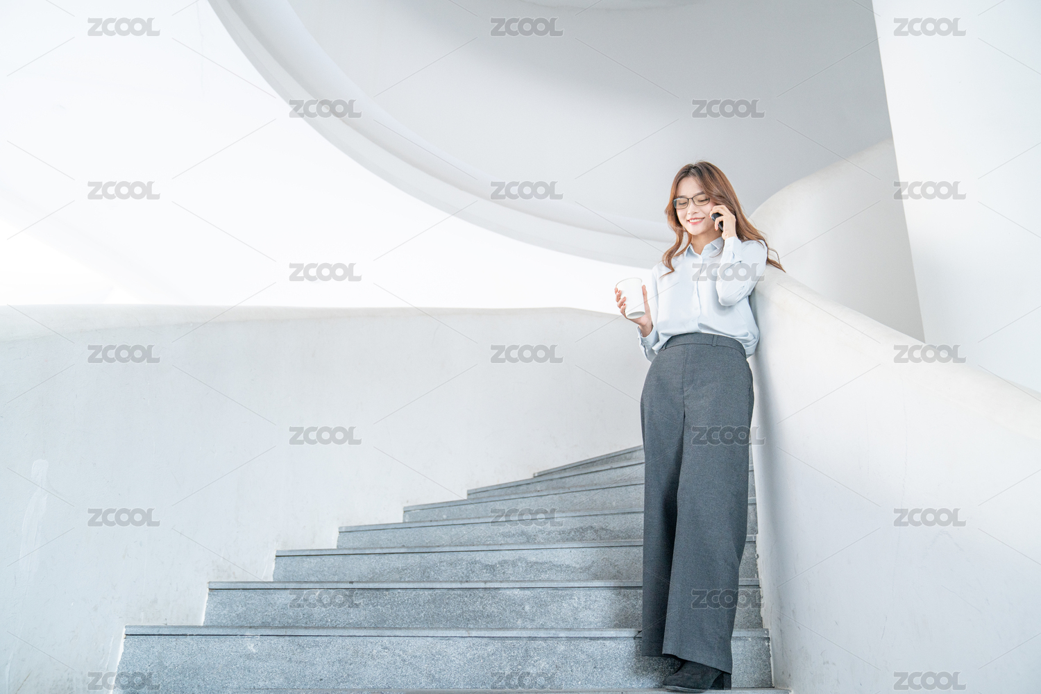 一个中国年轻职业女性边下楼梯边低头看着手机