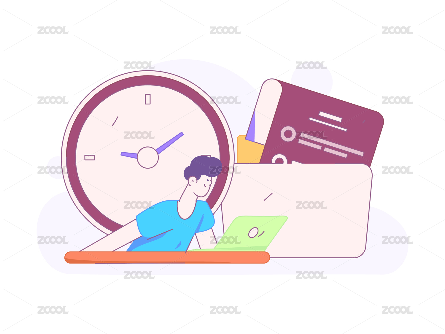 男士在电脑面前工作旁边放着闹钟矢量插画