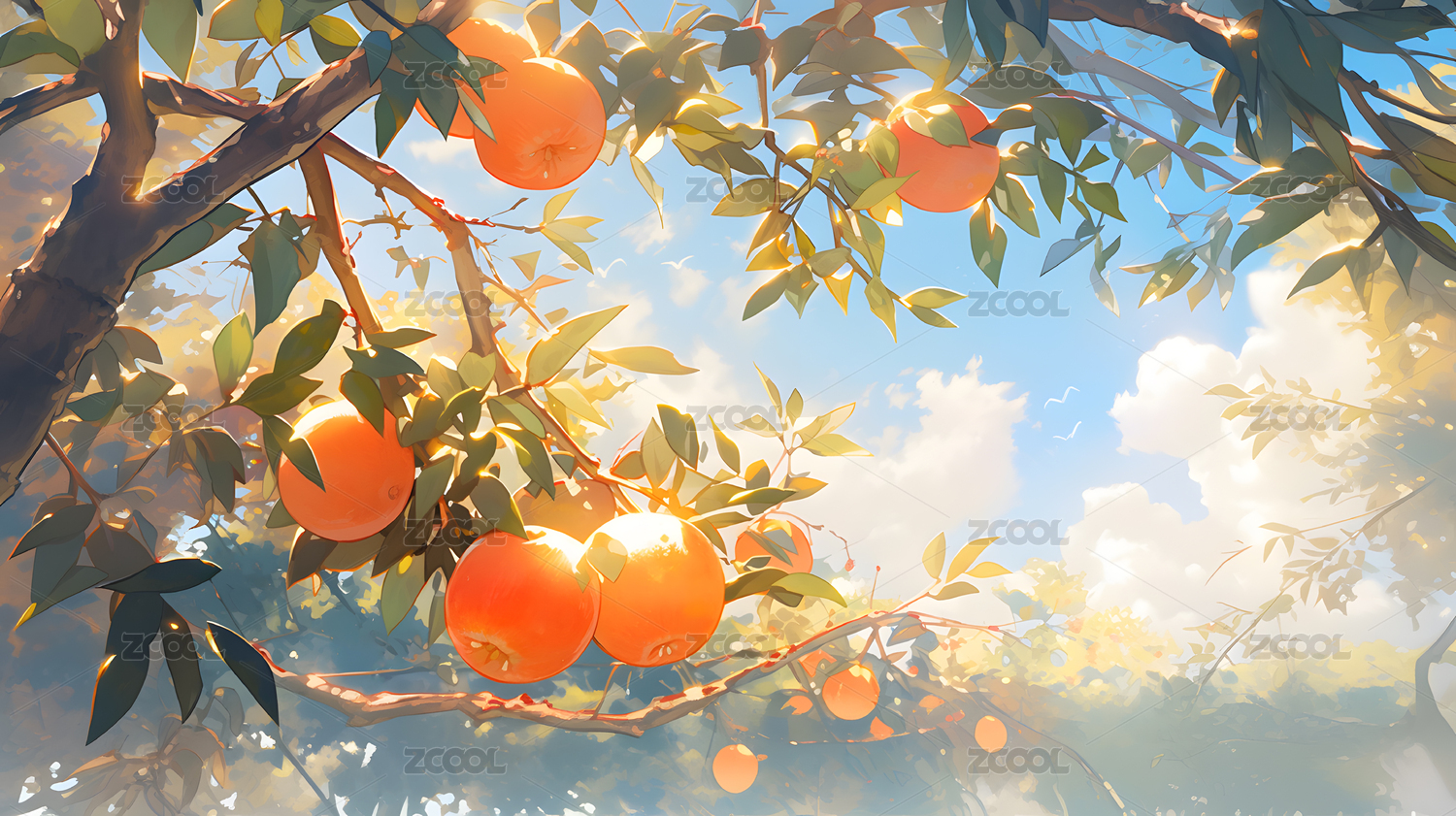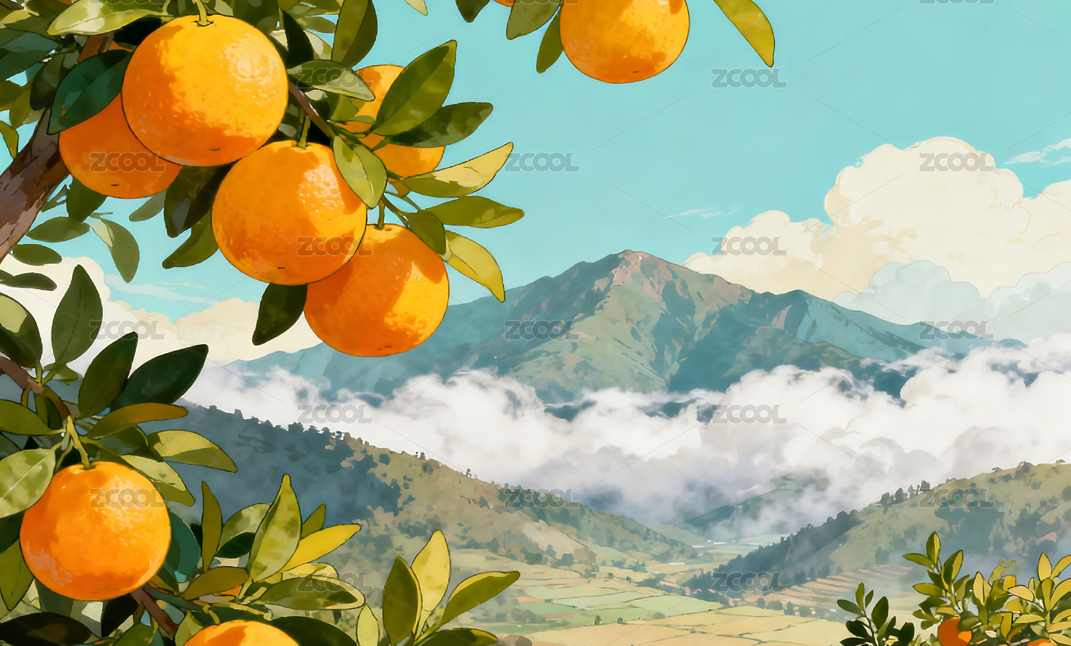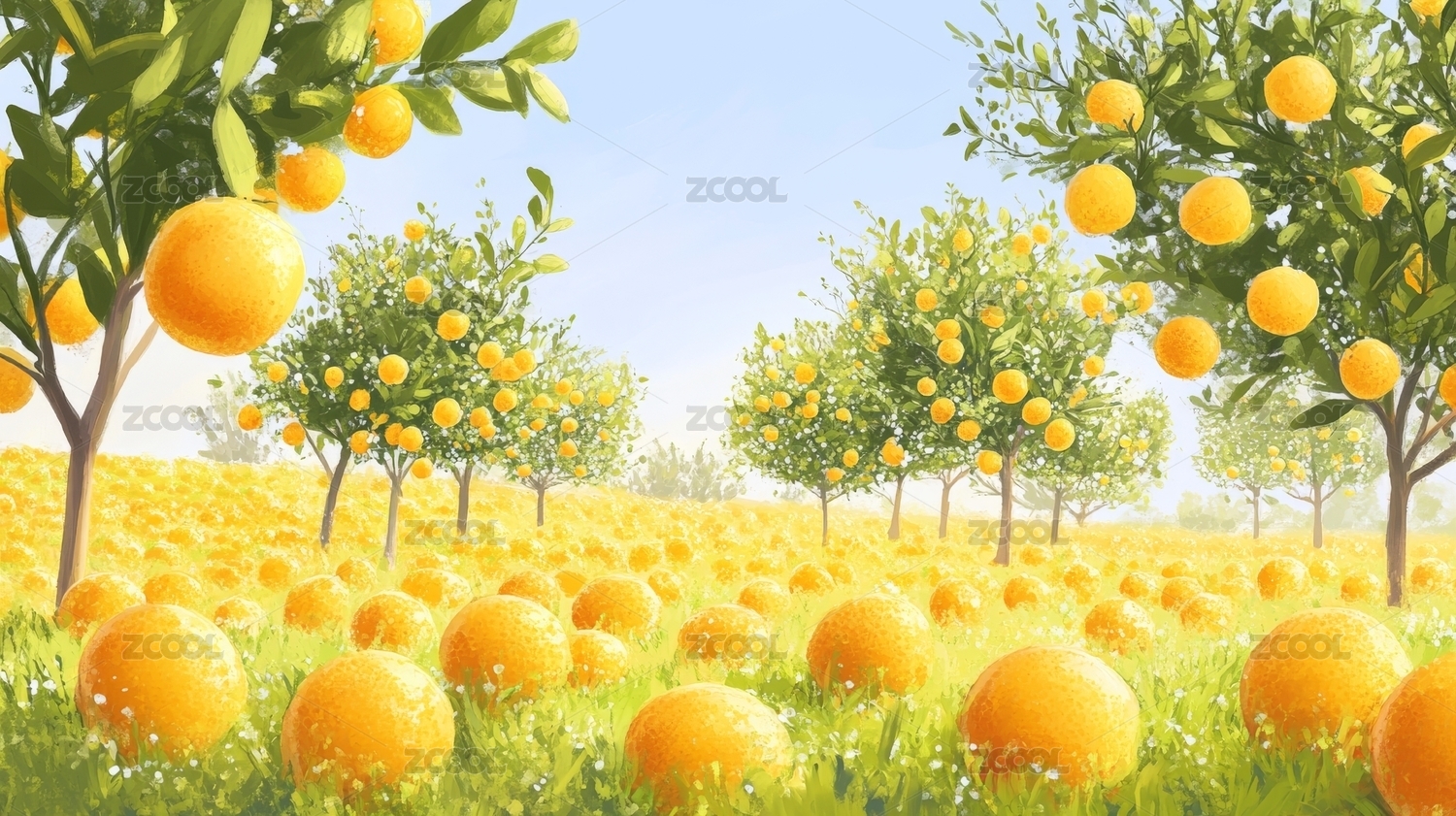 清新橘子树田园插画背景壁纸