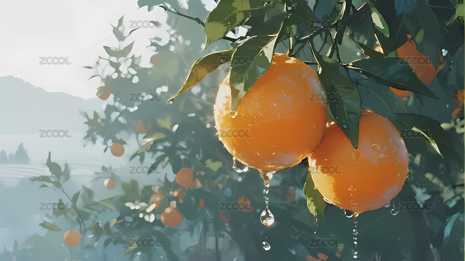 橙子挂枝头水滴晶莹剔透