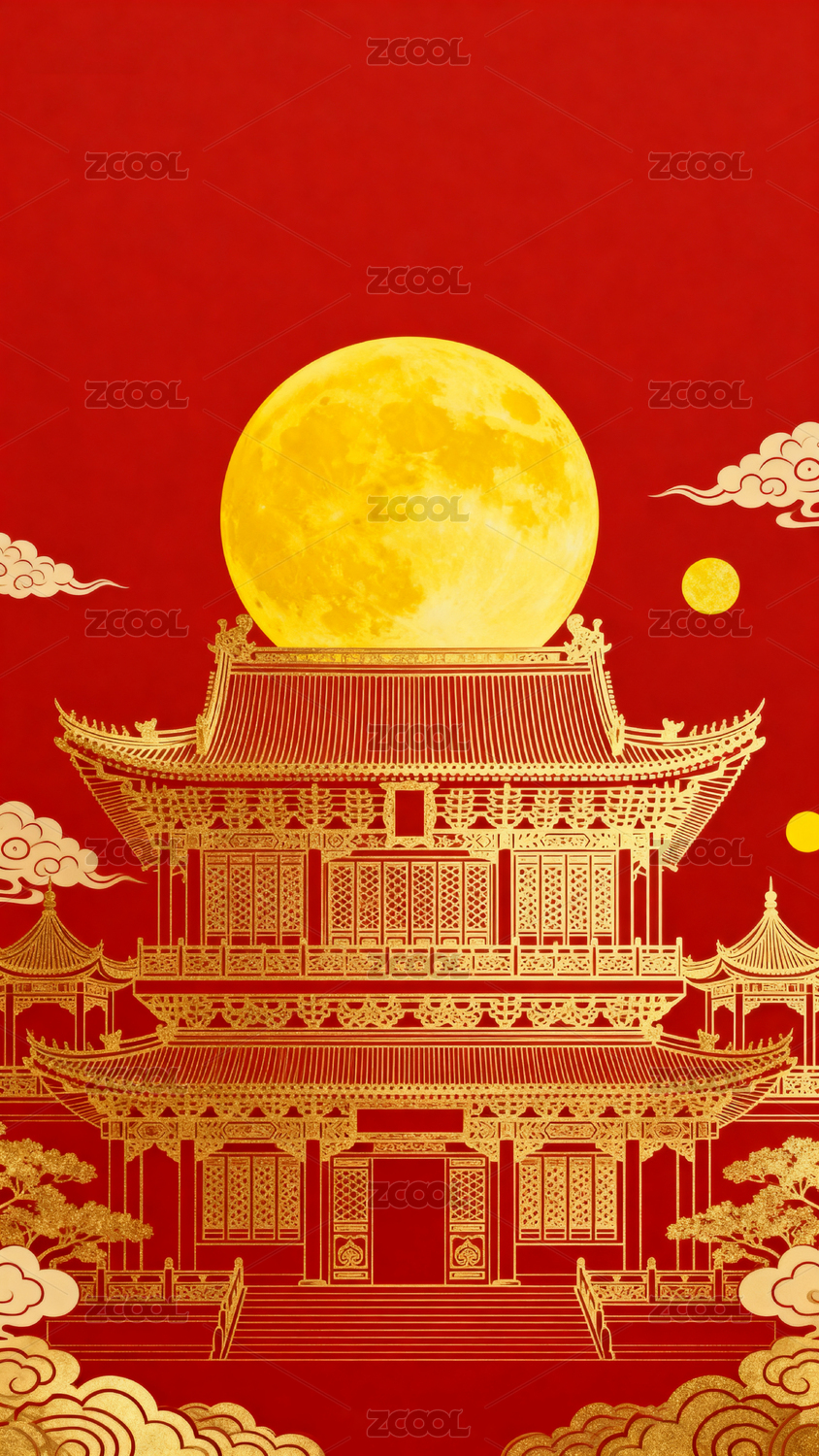 中国风红色背景明月照古楼