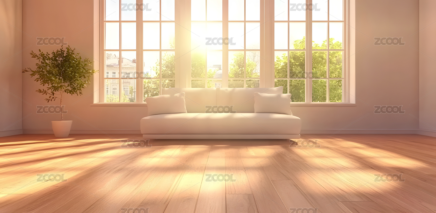 大窗绿植旁白色沙发配绿抱枕的客厅