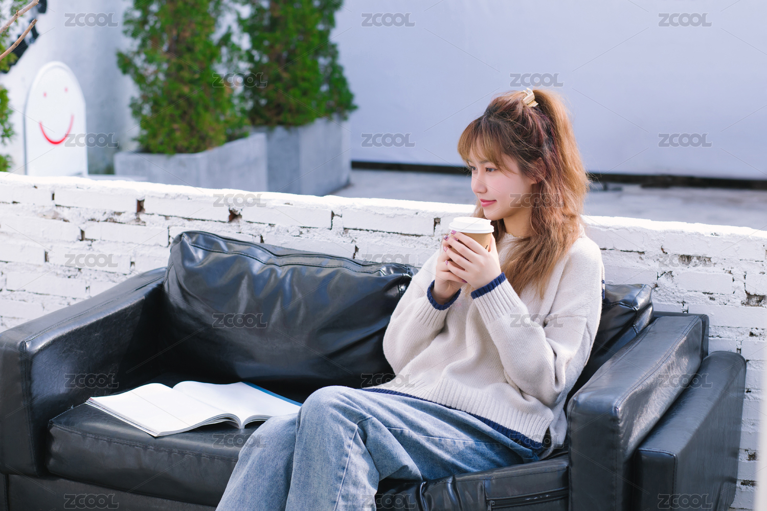 坐在在图书咖啡馆喝咖啡的少女
