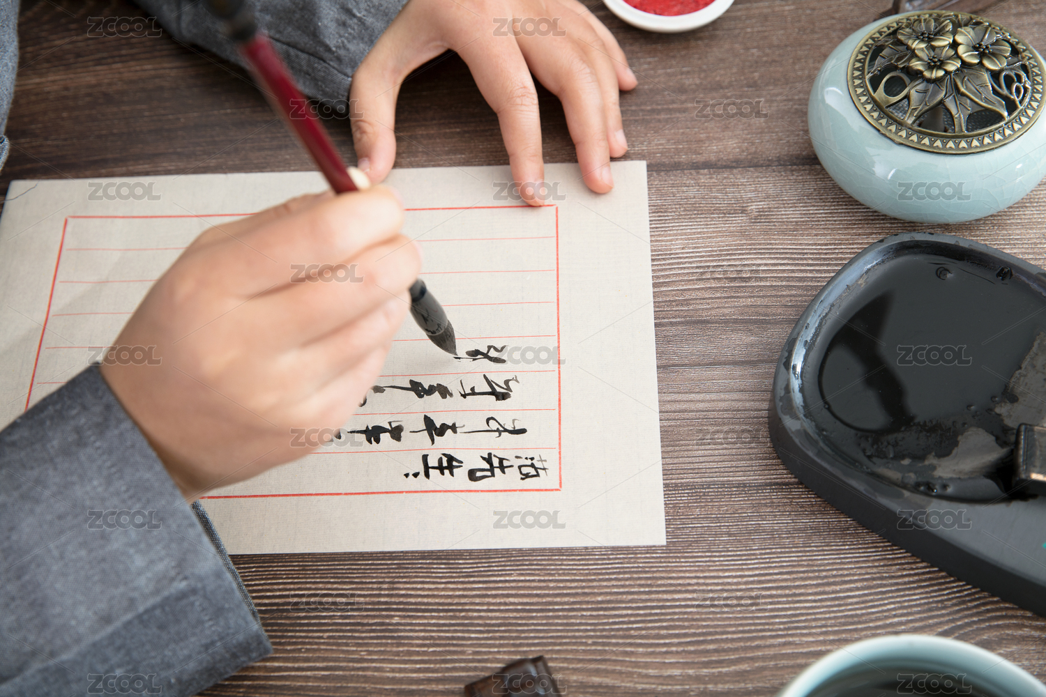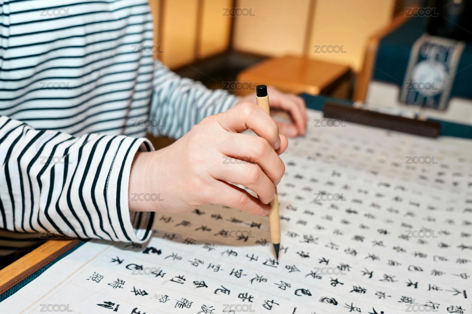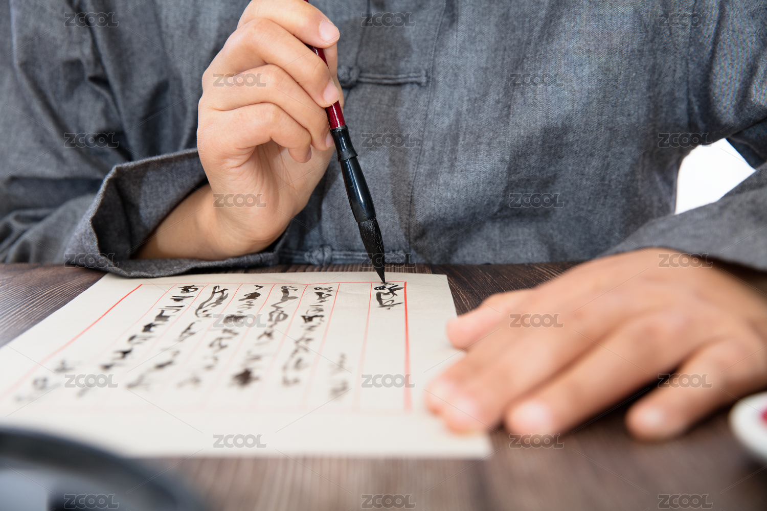 书法艺术家手持放大镜仔细欣赏王羲之的兰亭集序作品