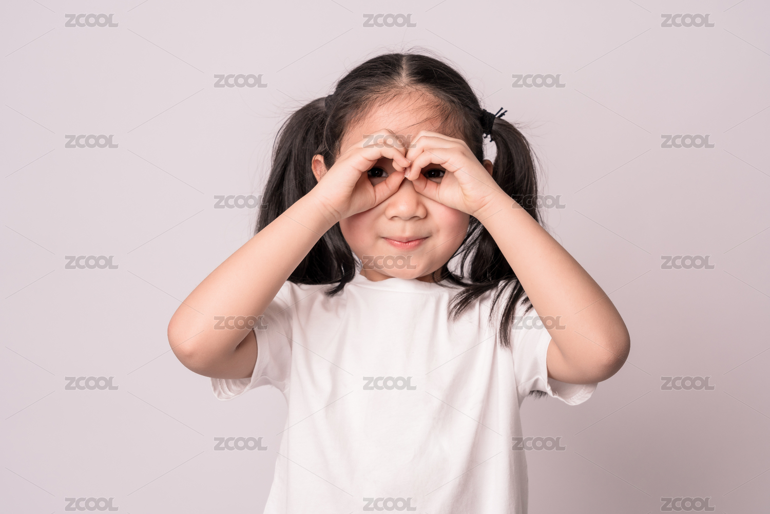 可爱的中国姑娘双手做成眼镜状放在脸上