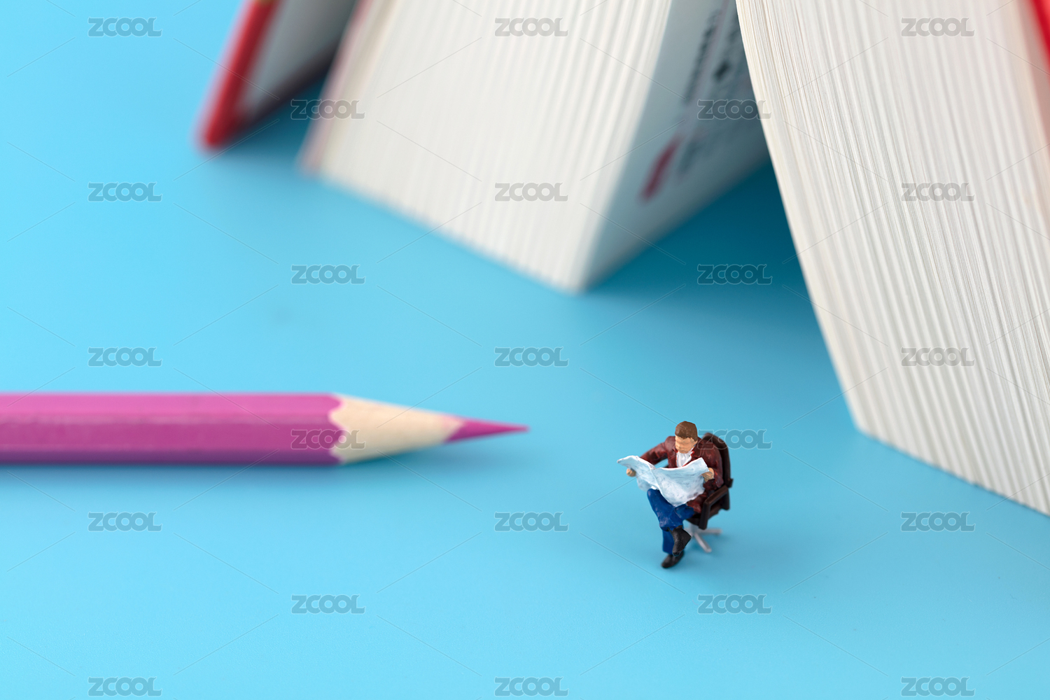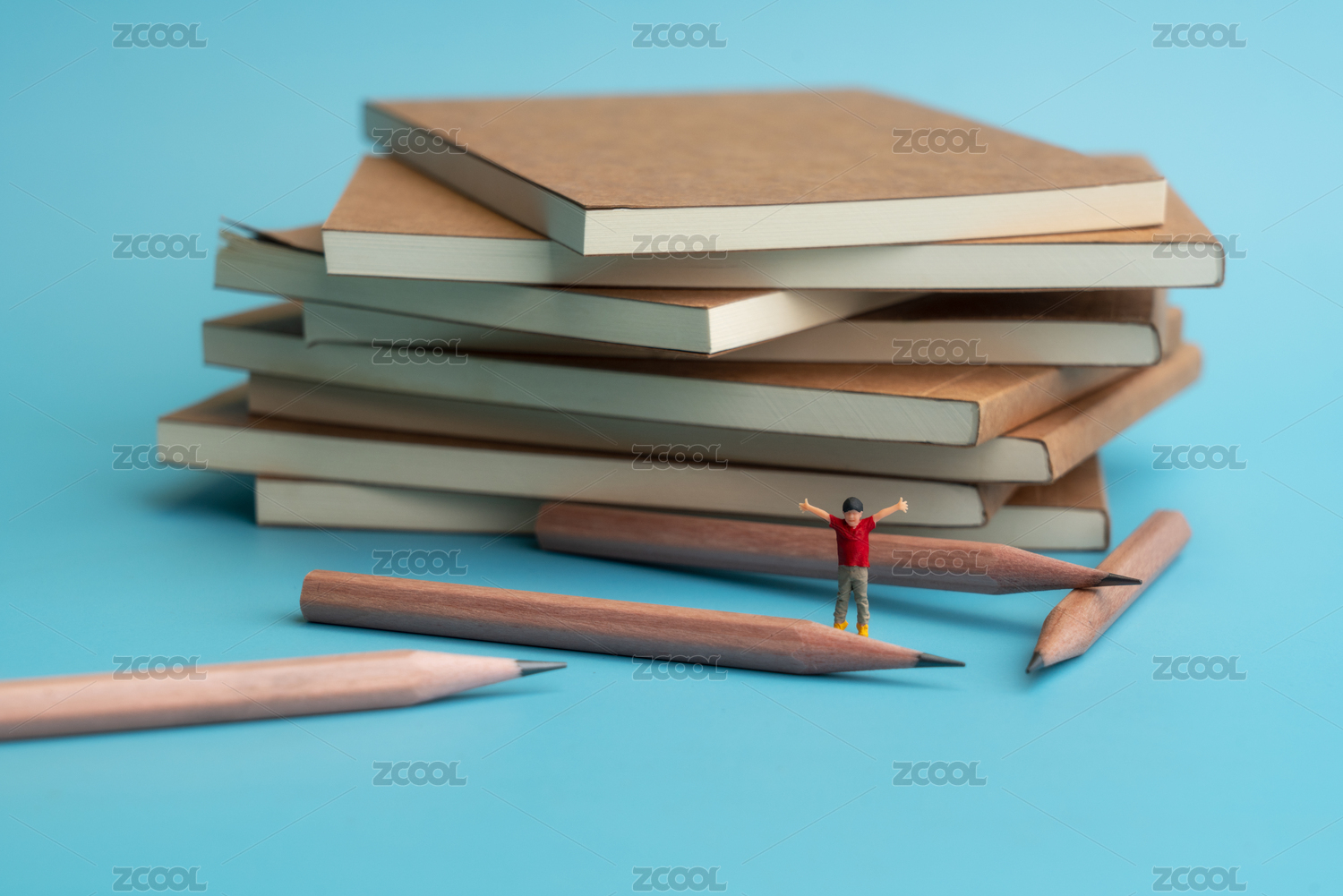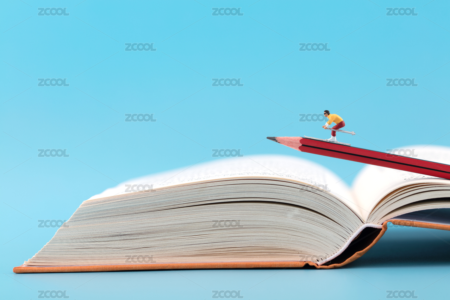 骑车的微缩模型通过彩铅笔到达书本顶端
