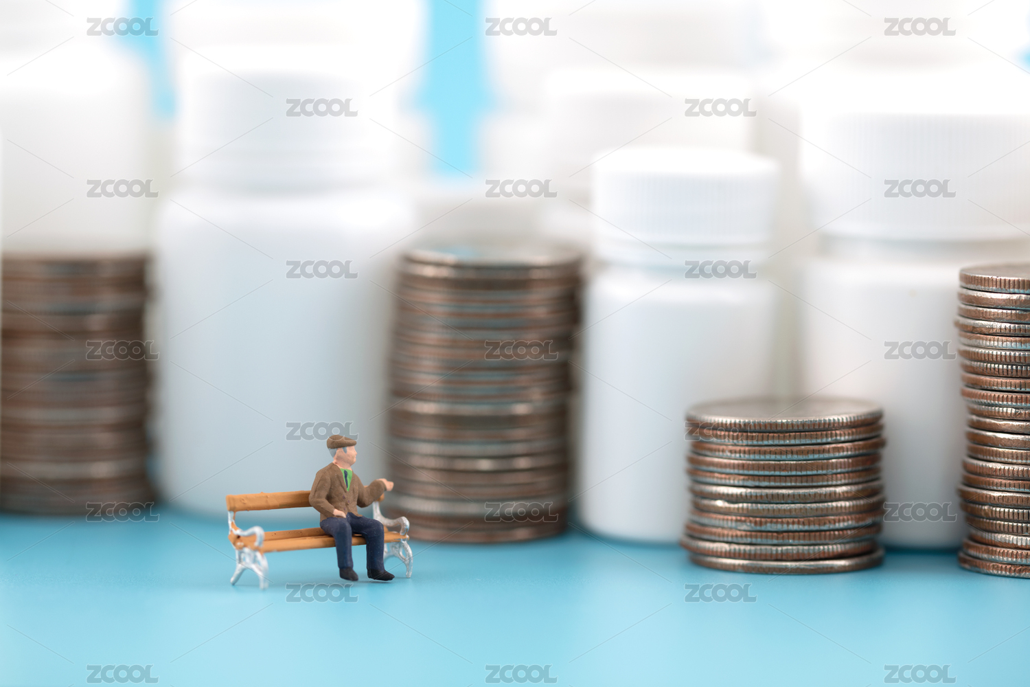 蓝背景前在一摞硬币顶端的胶囊和老人模型