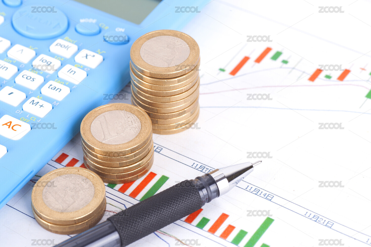 摆在桌上的计算器钢笔和金币——股票金融概念图片