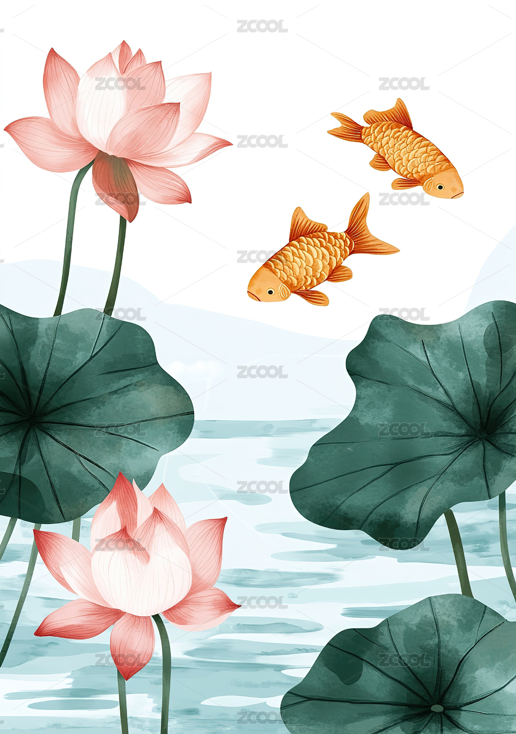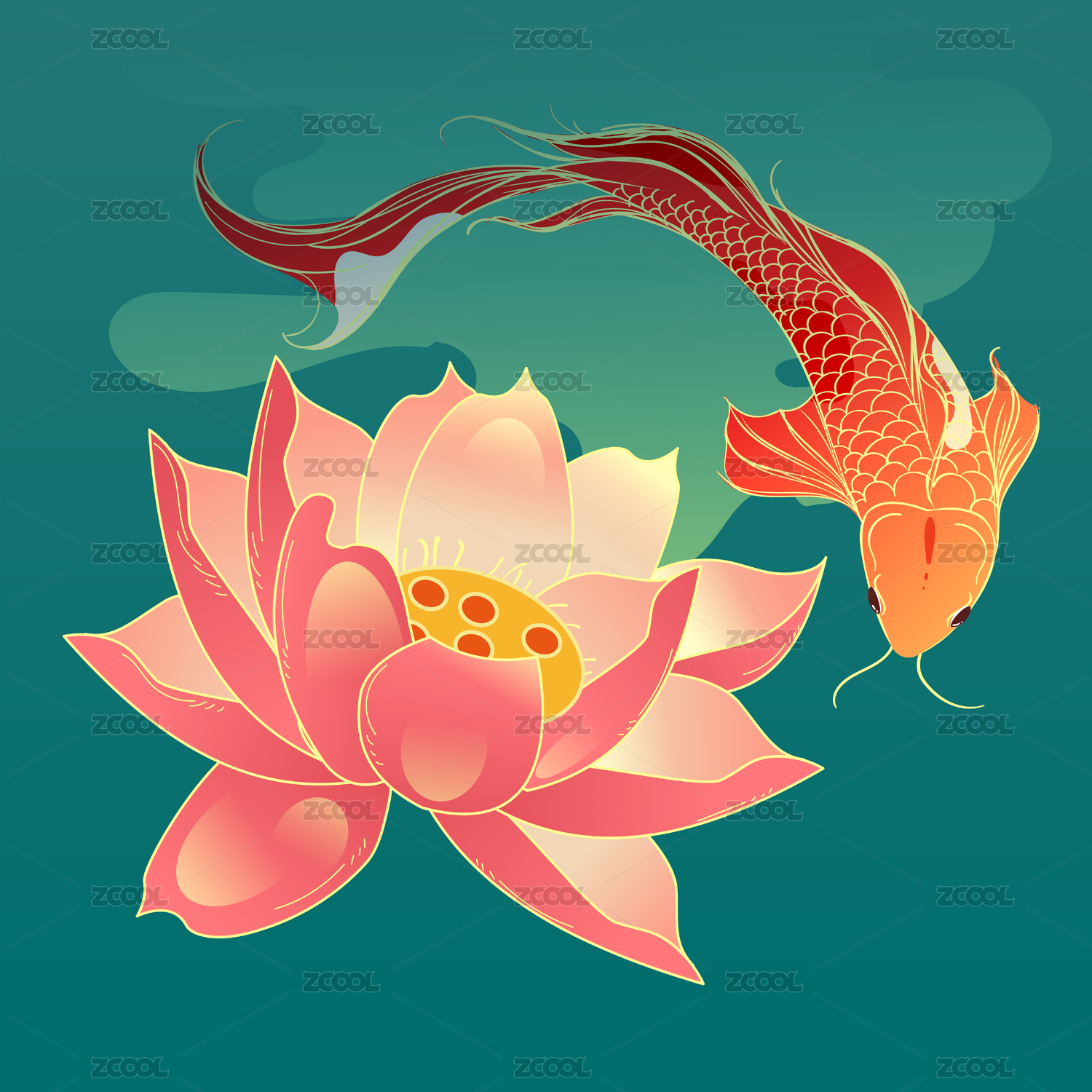 卡通夏天荷花池塘锦鲤中国风矢量插画素材