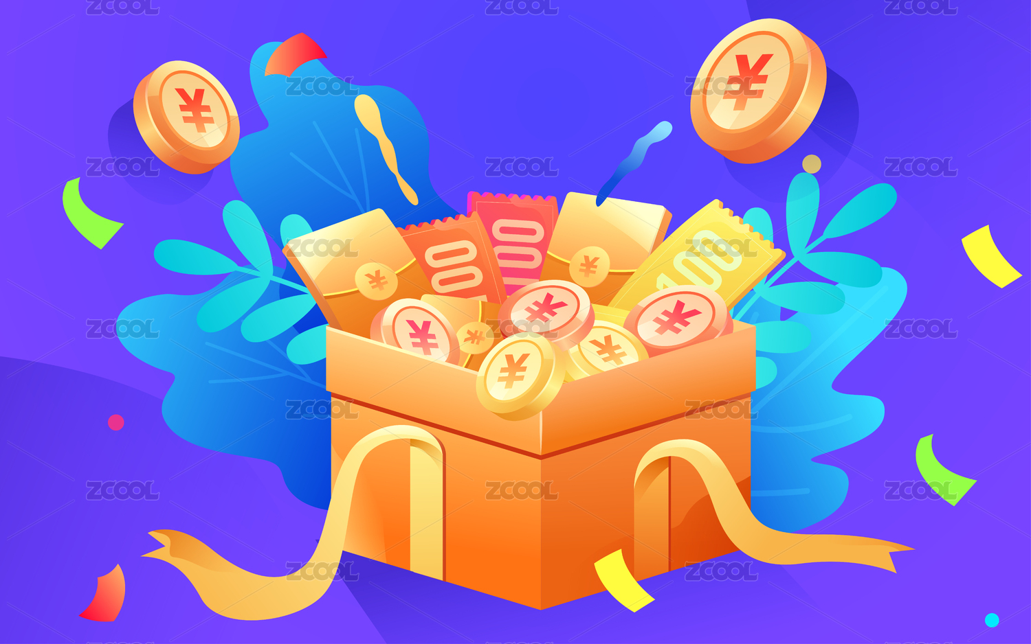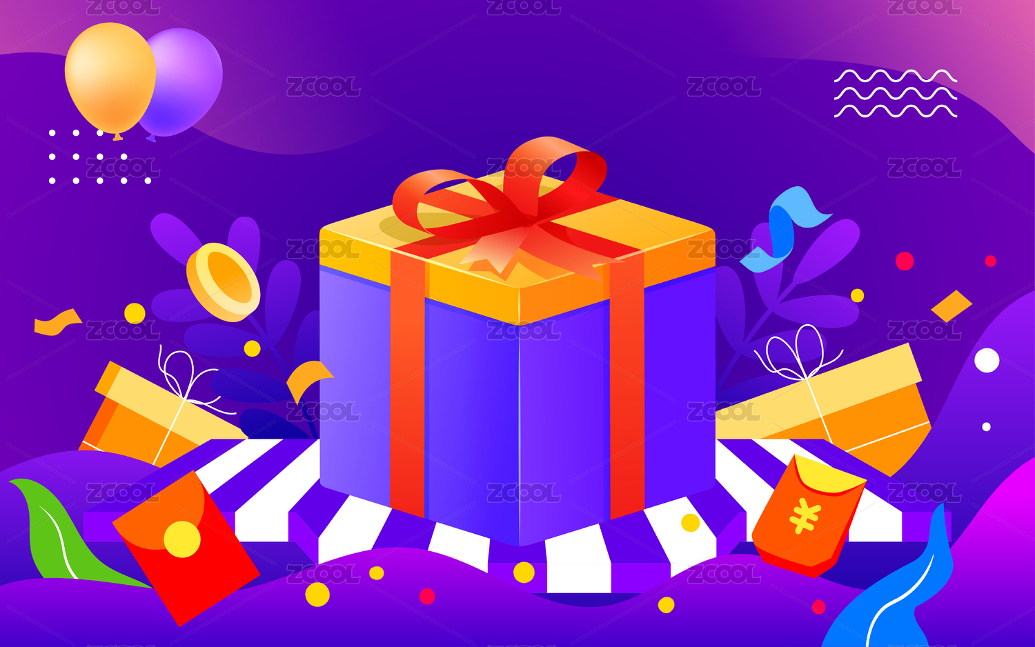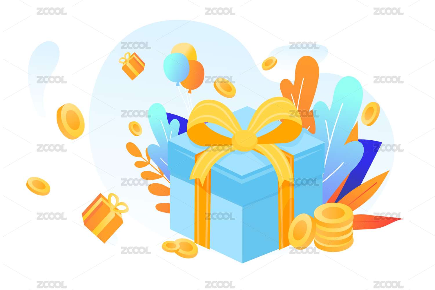 卡通礼盒金币红包优惠券矢量插画背景素材