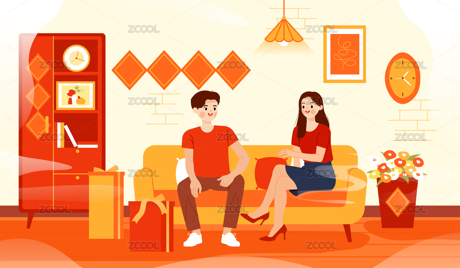 一对夫妇坐在沙发上新年插画