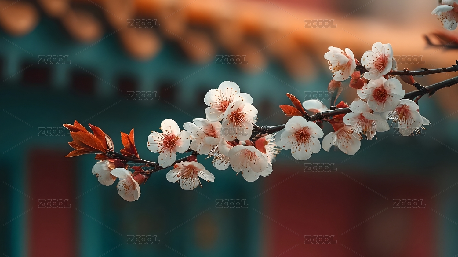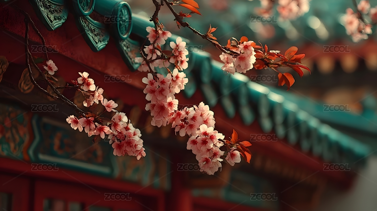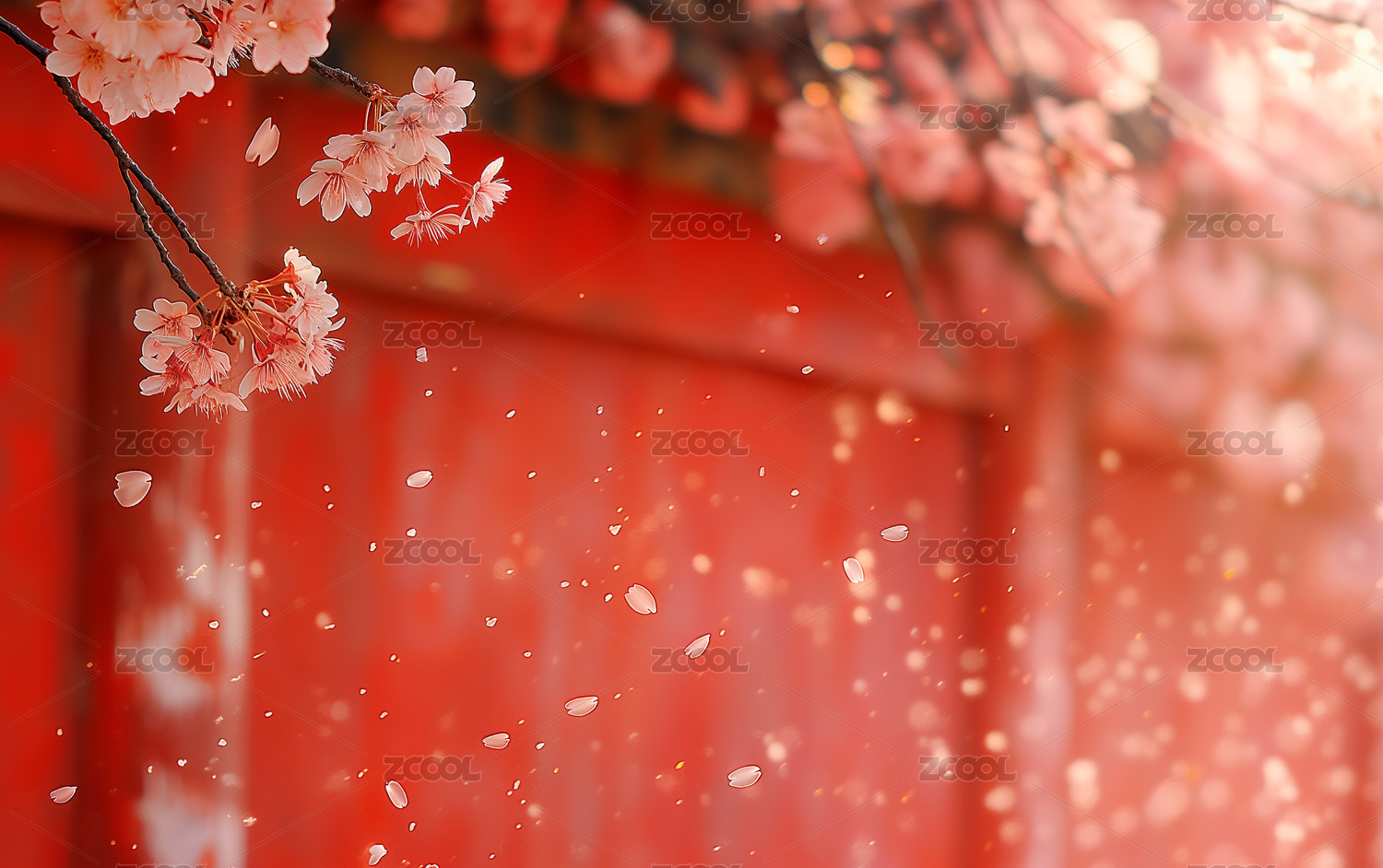 红色古建筑中樱花盛开