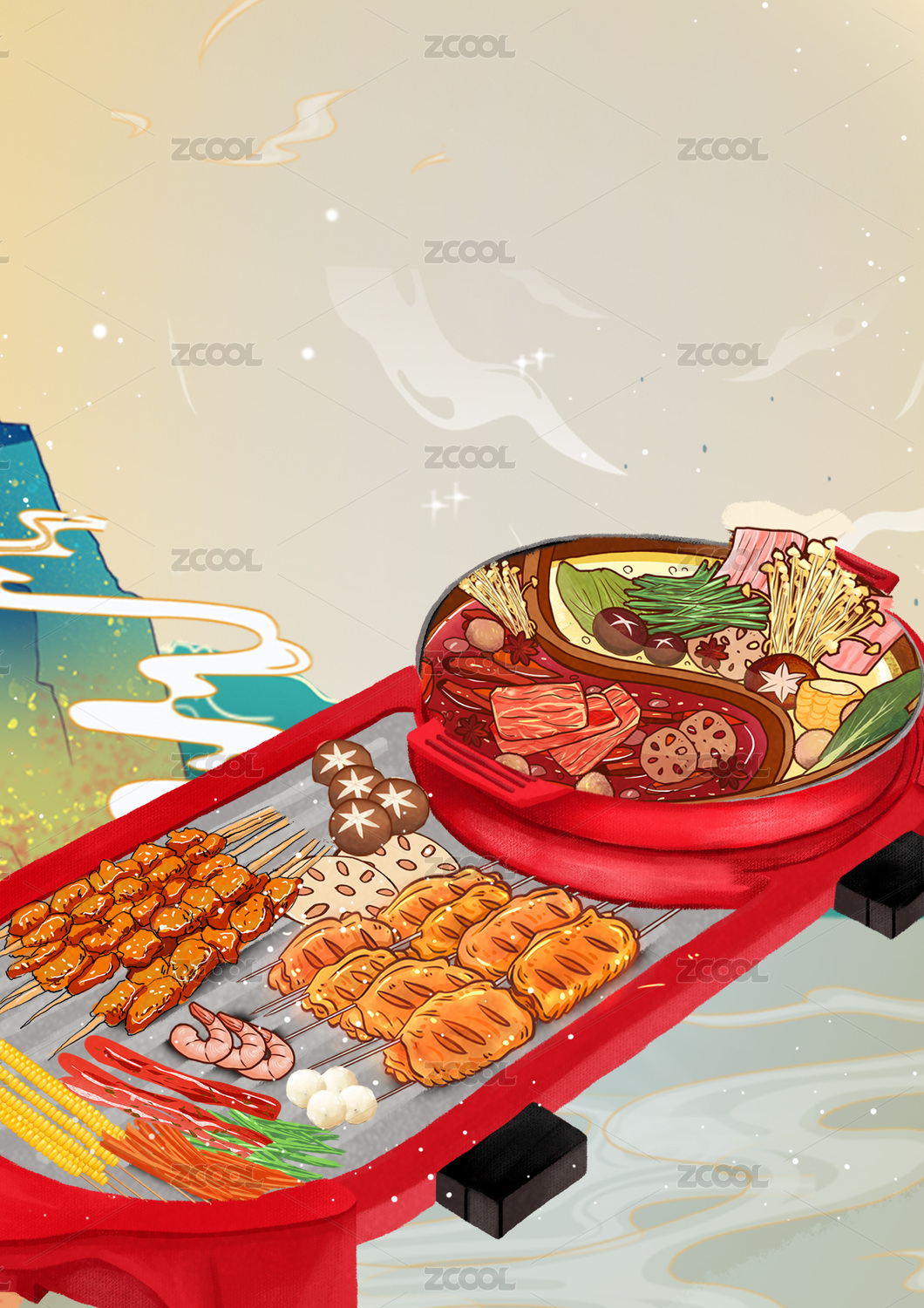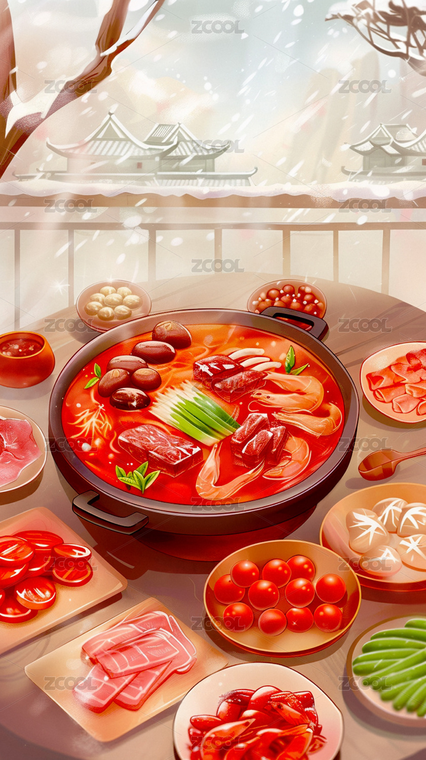 热气腾腾的美味自助火锅 牛肉蔬菜菌菇蛋糕卡通动漫风的矢量插画