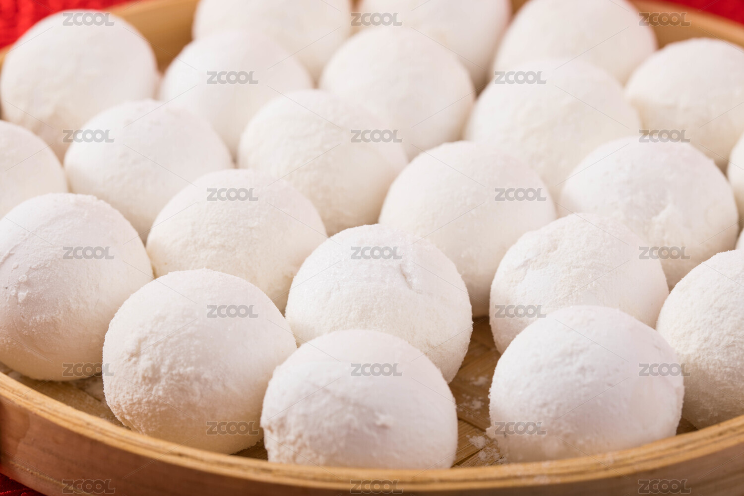 装在竹篾里的芝麻汤圆在红色背景上