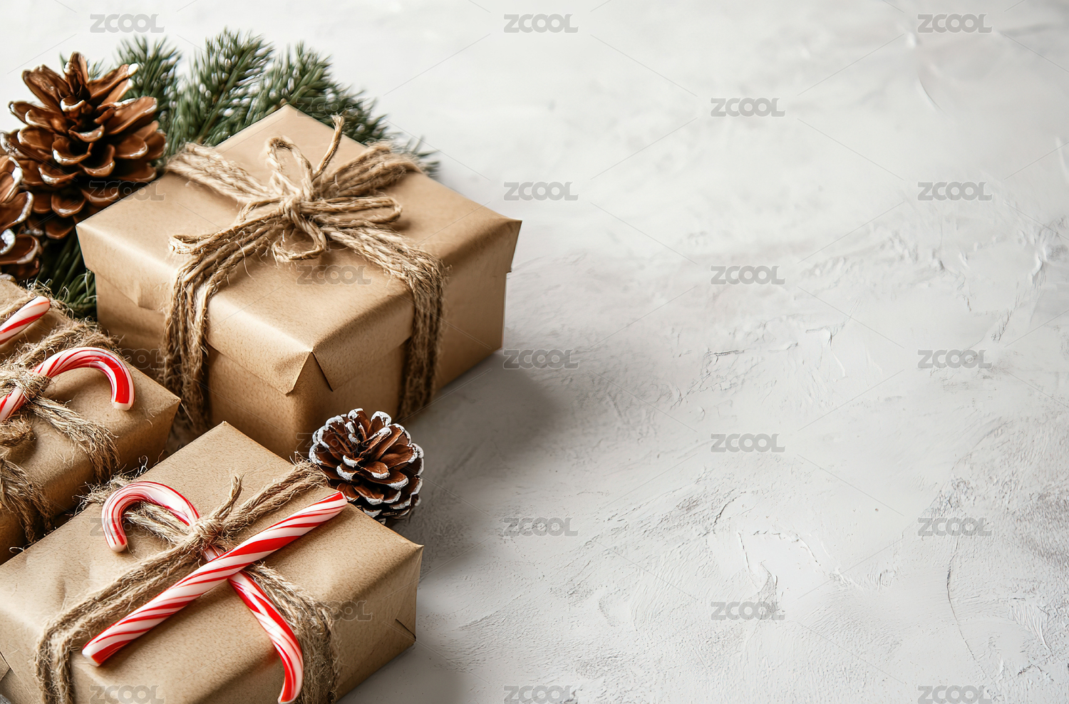 圣诞礼盒和圣诞节装饰品在桌子上,圣诞节节日礼物背景,粉色的礼盒和圣诞树,圣诞球,松果在桌子上