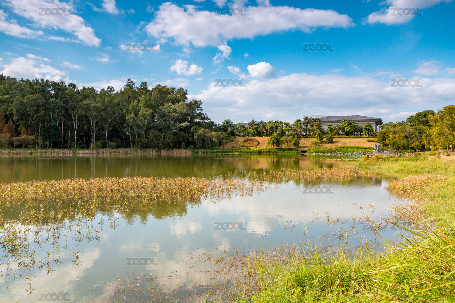 中国福建省厦门市五缘湾湿地公园阴天黑云下的湖面风光