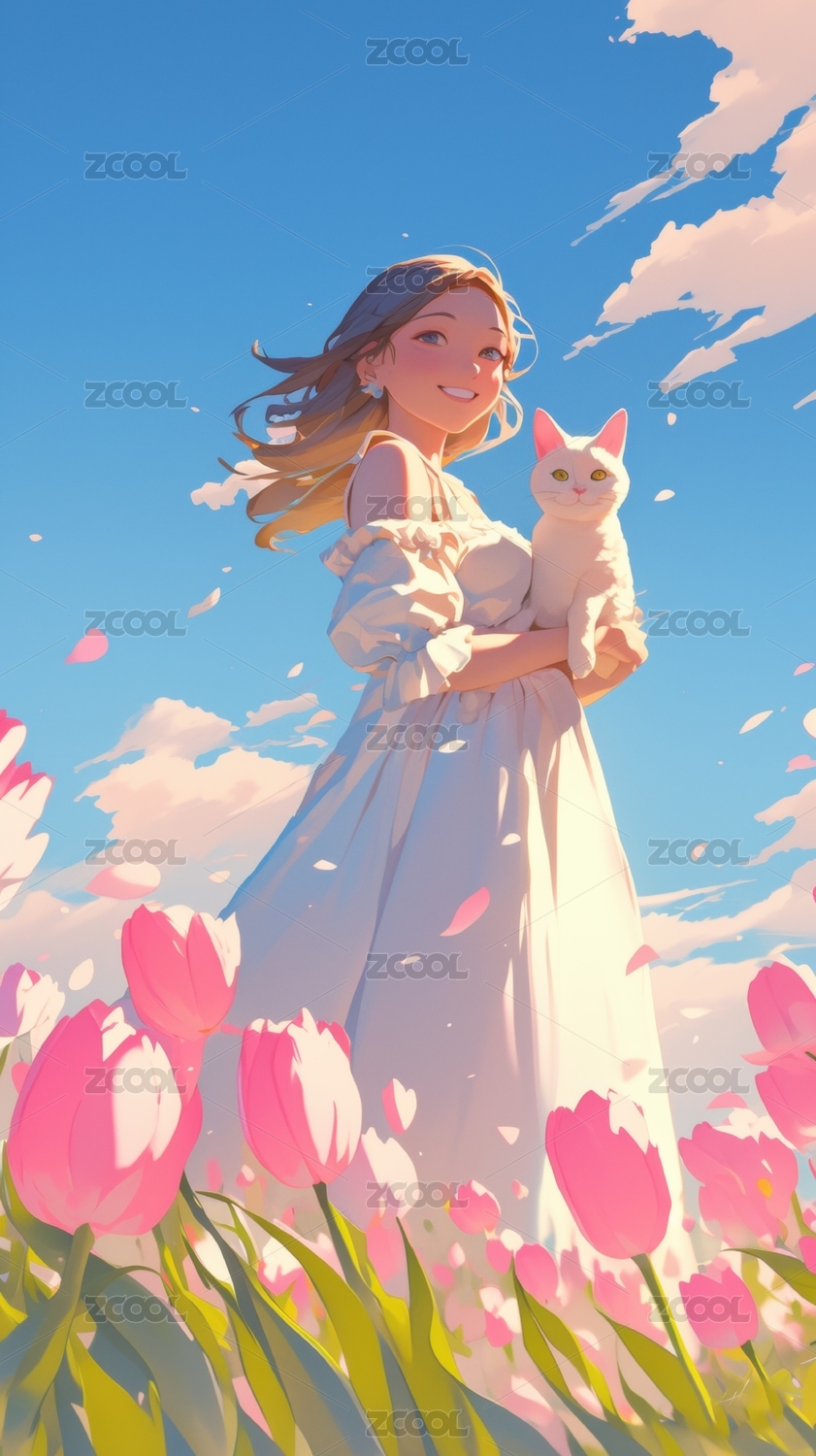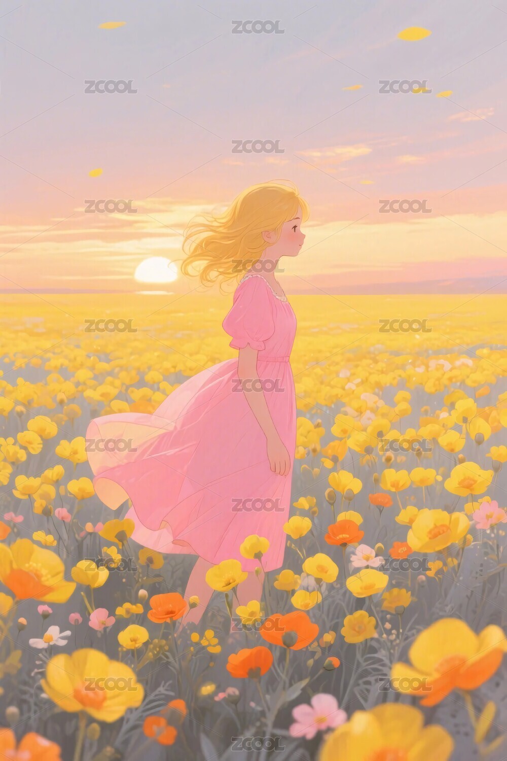 大海,蓝色背景,粉色,玫瑰花,少女,白衣,小狗,海滩,插画,治愈
