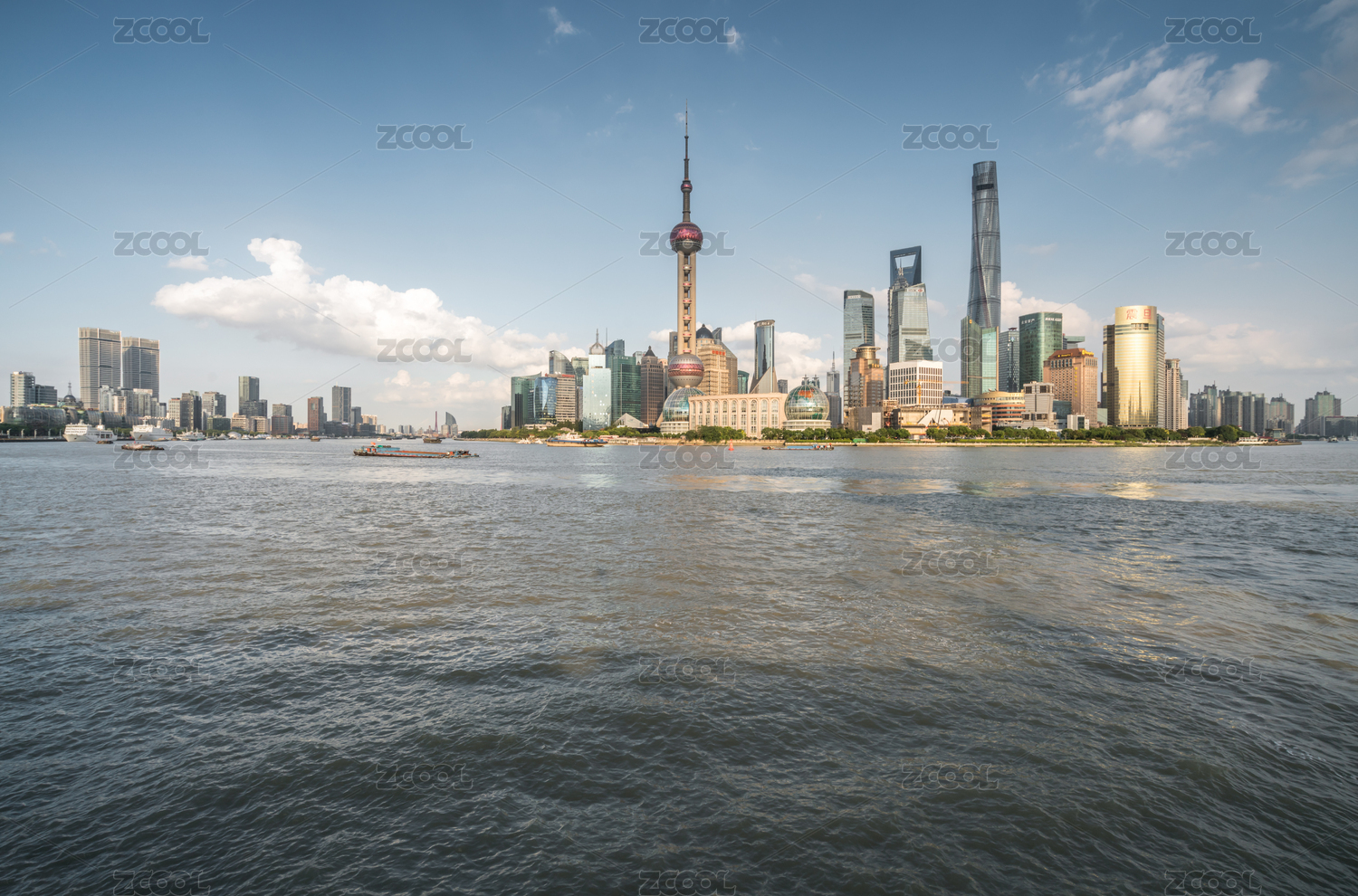 上海市中心建筑和黄浦江水面景观在晴朗夏天