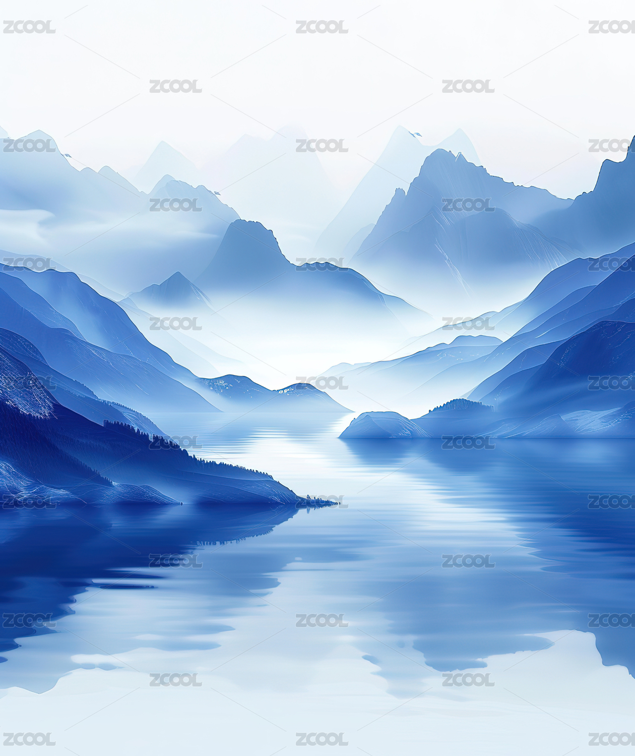 蓝色云雾山水画插画背景