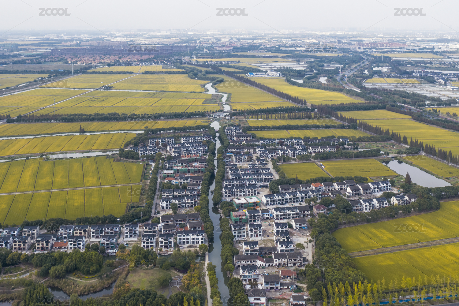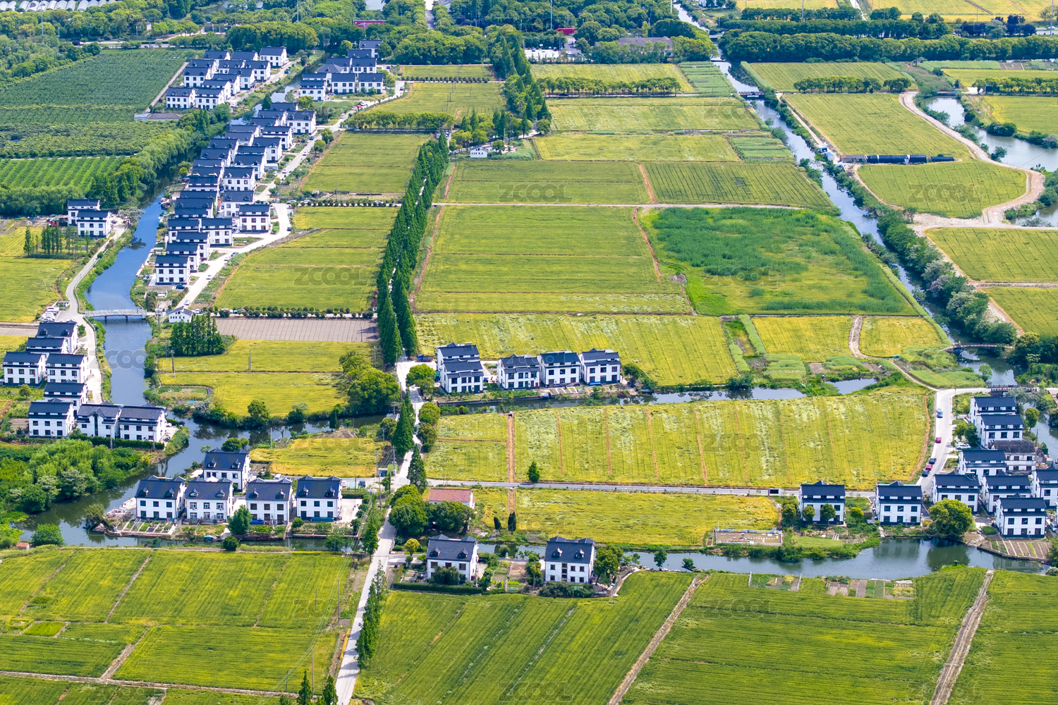 航拍视角,高视角,乡村,建筑,平原,地形,环境,田园风光,河流,居住区