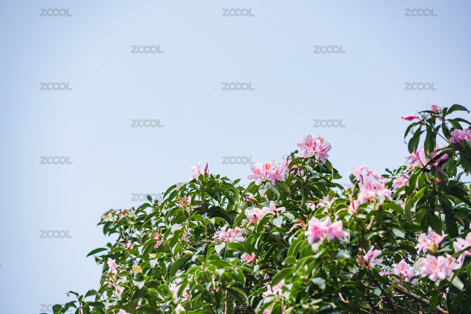 蓝天绿树映衬的花