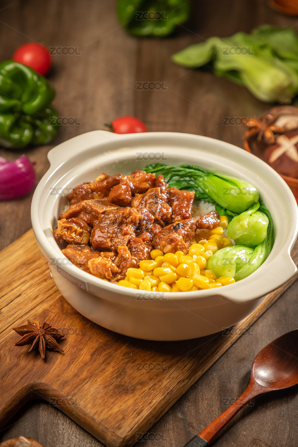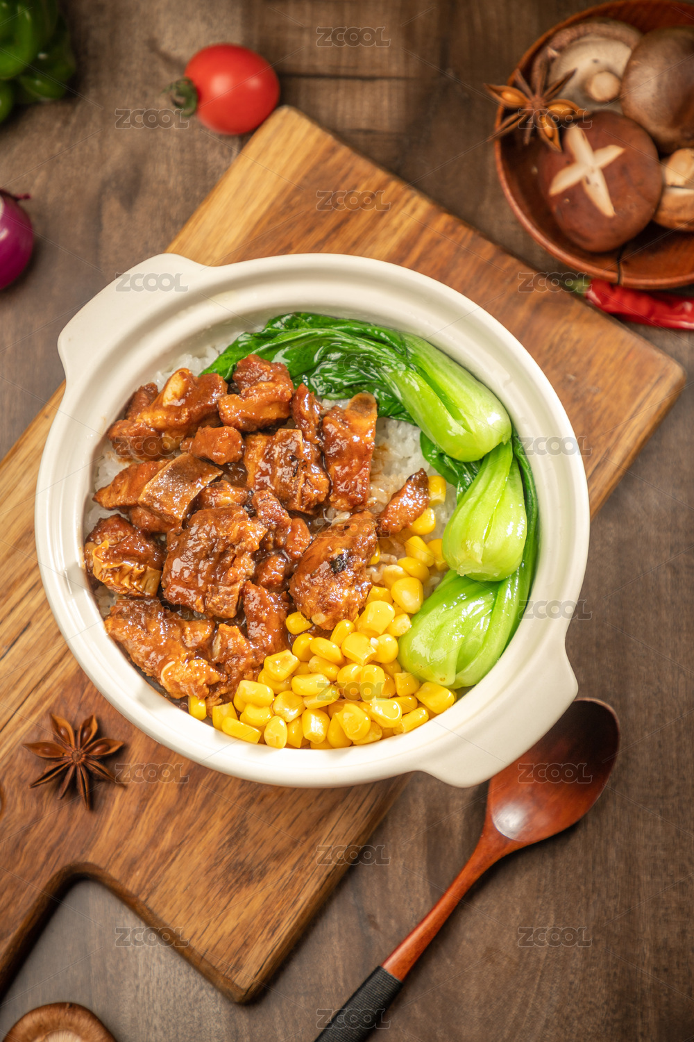 棕色木纹桌上放着一碗牛肉煲仔饭